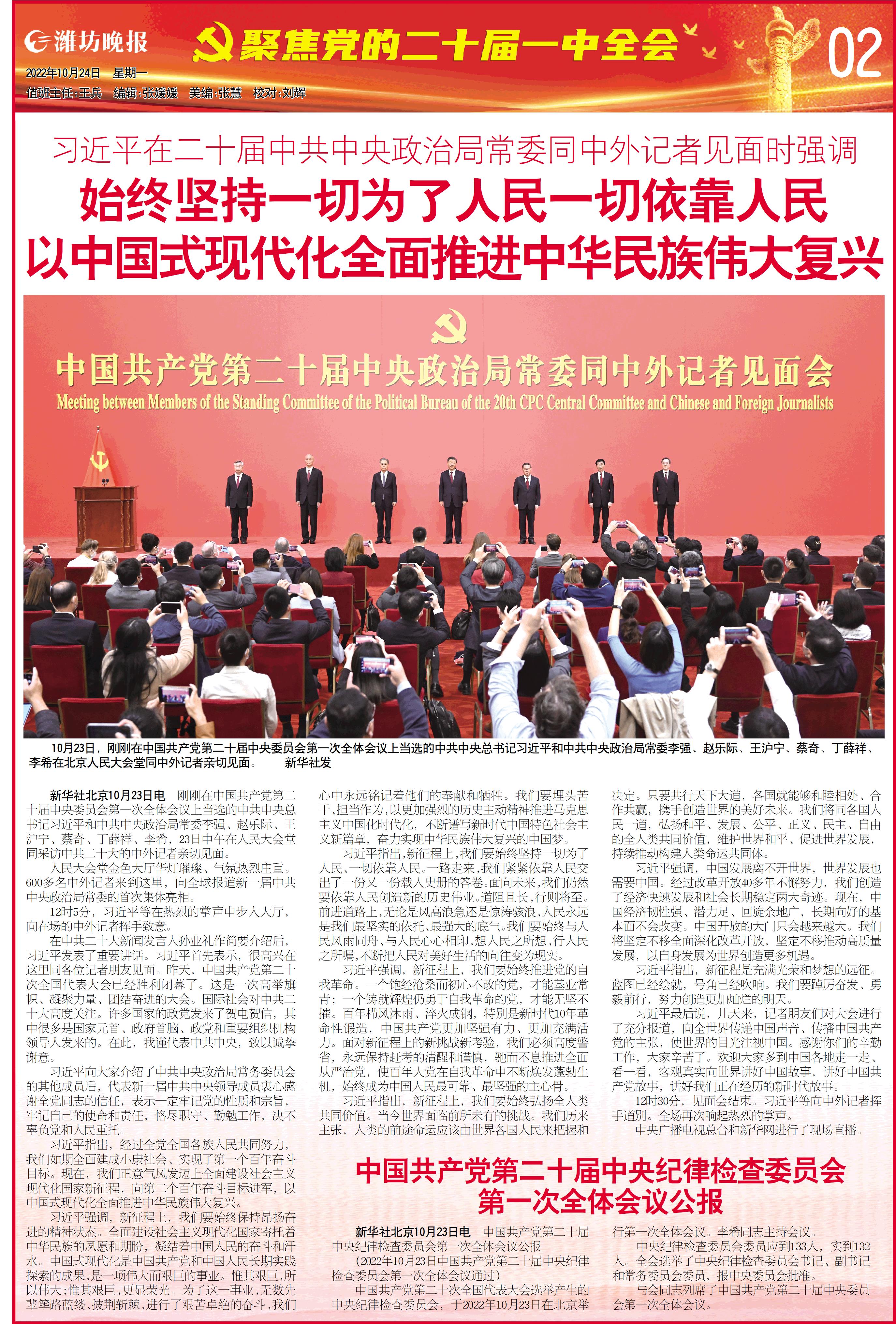 新华社北京10月23日电 中国共产党第二十届中央纪律检查委员会第一次全体会议公报