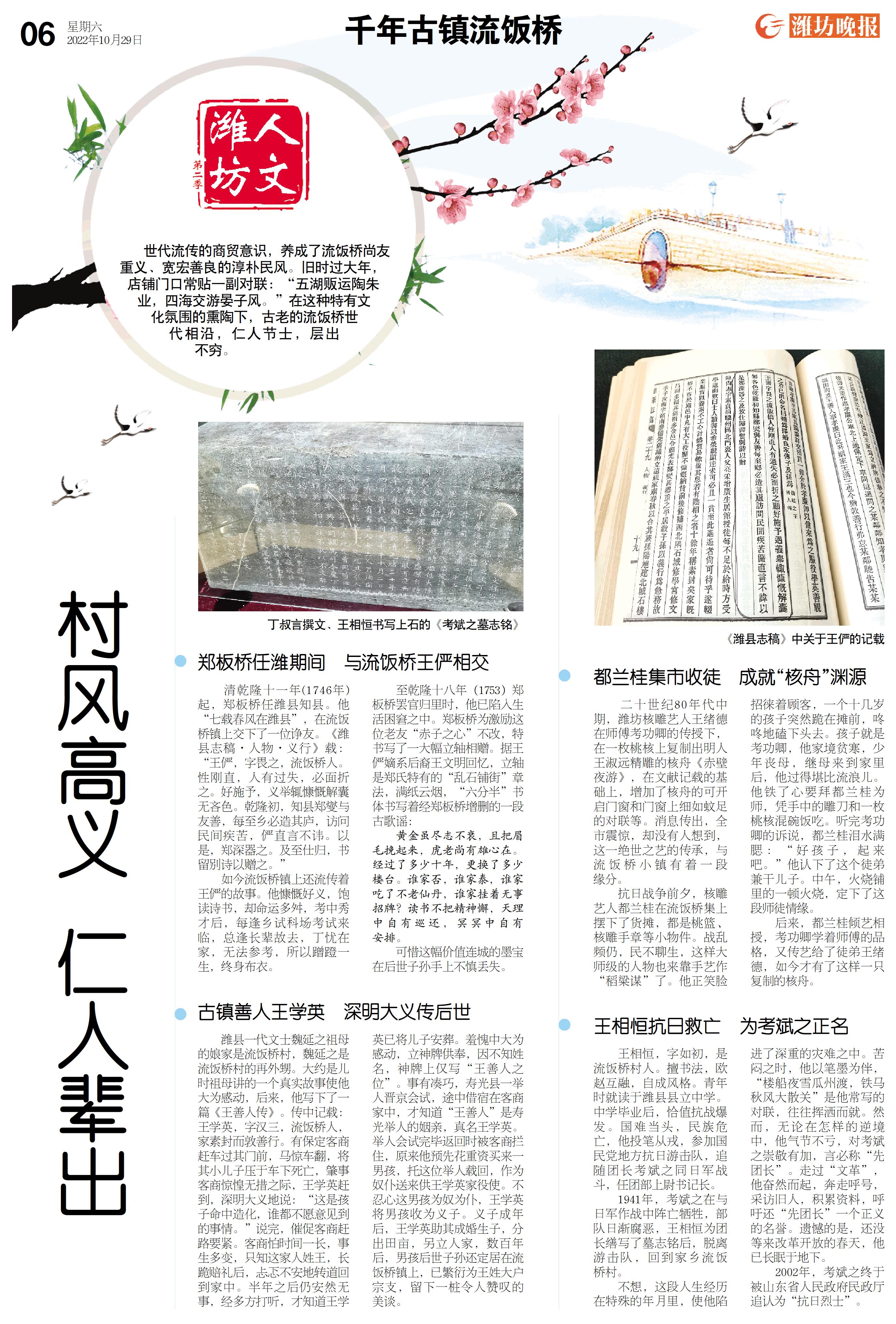潍县一代文士魏延之祖母的娘家是流饭桥村,魏延之是流饭桥村的再外甥。大约是儿时祖母讲的一个真实故事使他大为感动,后来,他写下了一篇《王善人传》。传中记载:王学英,字汉三,流饭桥人,家素封而敦善行。有保定客商赶车过其门前,马惊车翻,将其小儿子压于车下死亡,肇事客商惊惶无措之际,王学英赶到,深明大义地说:“这是孩子命中造化,谁都不愿意见到的事情。”说完,催促客商赶路要紧。客商怕时间一长,事生多变,只知这家人姓王,长跪赔礼后,忐忑不安地转道回到家中。半年之后仍安然无事,经多方打听,才知道王学英已将儿子安葬。羞愧中大为感动,立神牌供奉,因不知姓名,神牌上仅写“王善人之位”。事有凑巧,寿光县一举人晋京会试,途中借宿在客商家中,才知道“王善人”是寿光举人的姻亲,真名王学英。举人会试完毕返回时被客商拦住,原来他预先花重资买来一男孩,托这位举人载回,作为奴仆送来供王学英家役使。不忍心这男孩为奴为仆,王学英将男孩收为义子。义子成年后,王学英助其成婚生子,分出田亩,另立人家,数百年后,男孩后世子孙还定居在流饭桥镇上,已繁衍为王姓大户宗支,留下一桩令人赞叹的美谈。