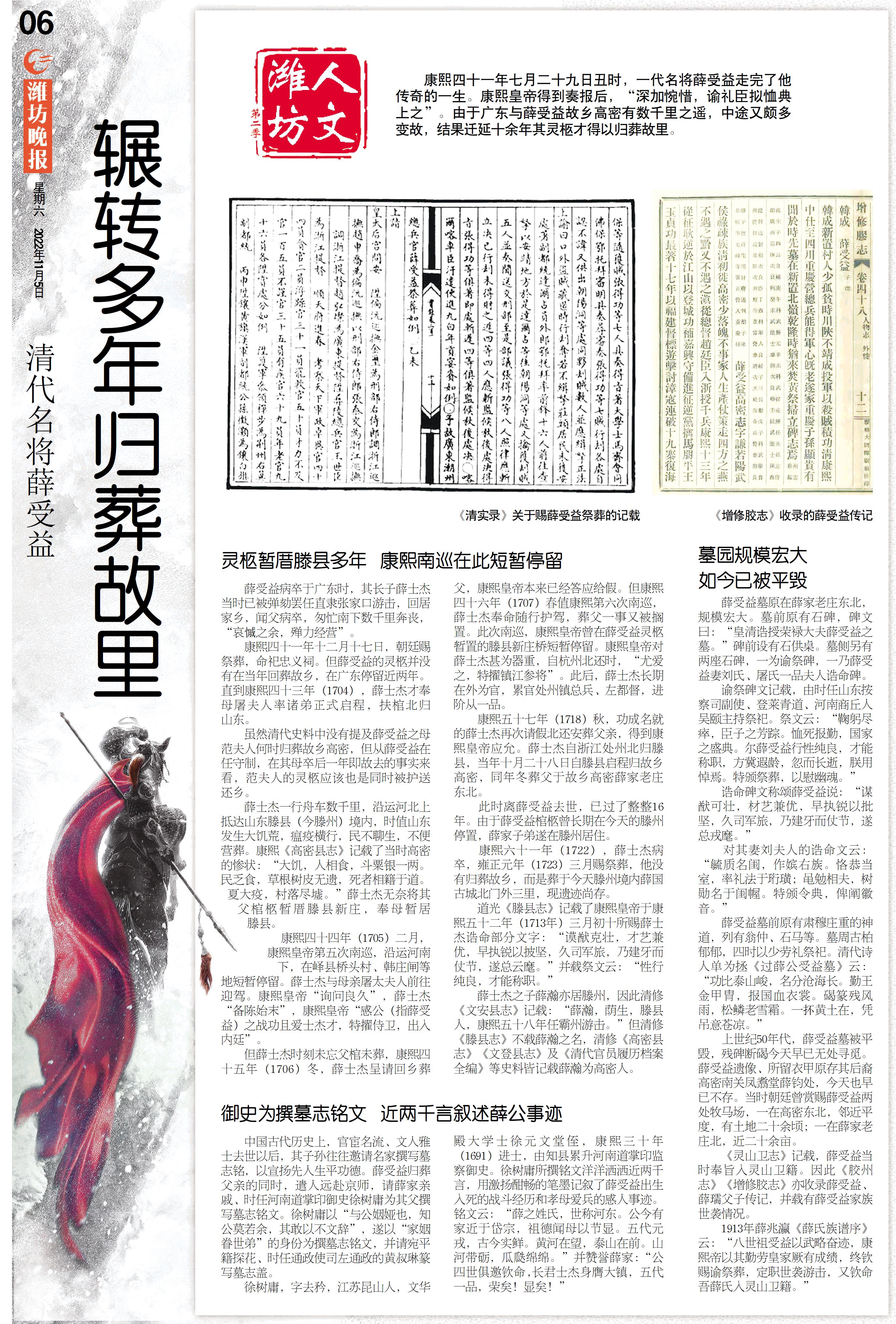 康熙四十一年七月二十九日丑时,一代名将薛受益走完了他传奇的一生。康熙皇帝得到奏报后,“深加惋惜,谕礼臣拟恤典上之”。由于广东与薛受益故乡高密有数千里之遥,中途又颇多变故,结果迁延十余年其灵柩才得以归葬故里。