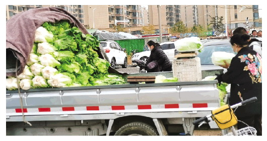 高新区王谭集贸市场上,商贩拉着一车白菜来销售。