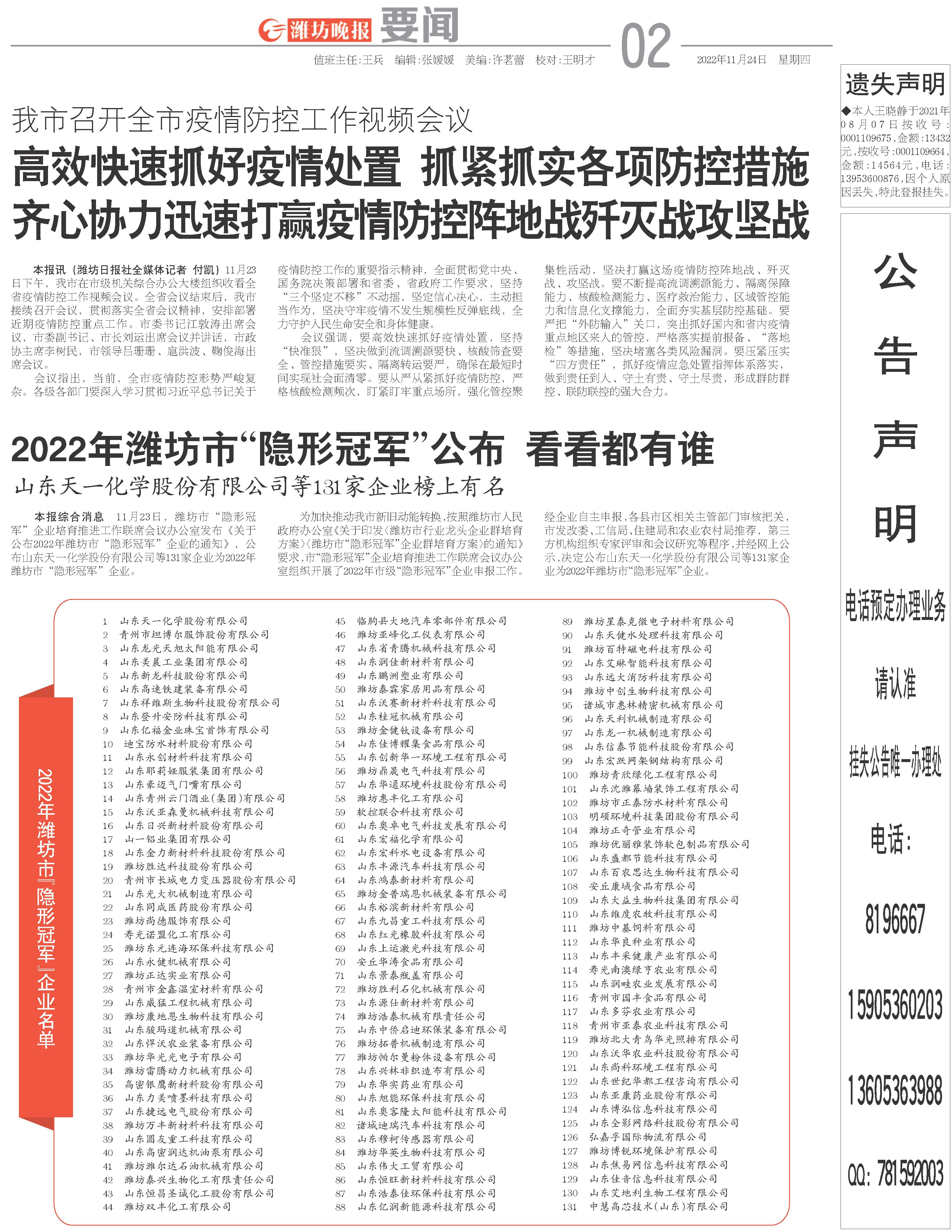 本报综合消息 11月23日,潍坊市“隐形冠军”企业培育推进工作联席会议办公室发布《关于公布2022年潍坊市“隐形冠军”企业的通知》,公布山东天一化学股份有限公司等131家企业为2022年潍坊市“隐形冠军”企业。