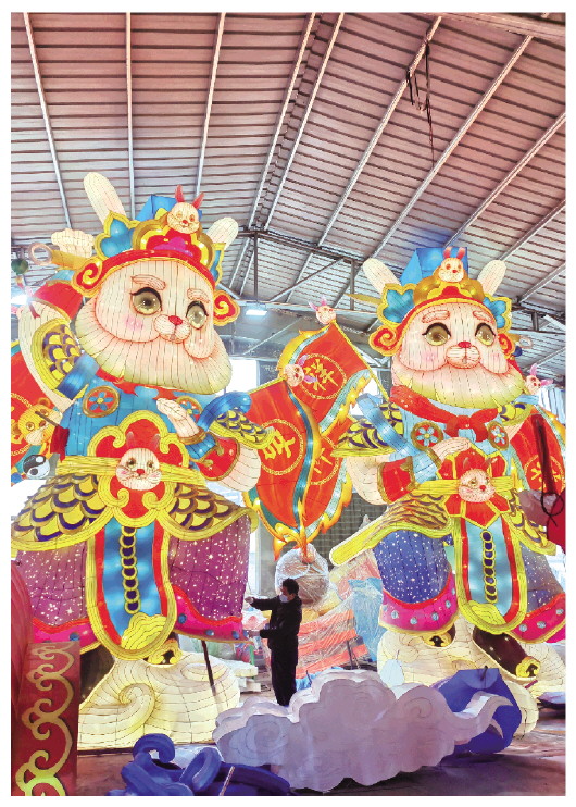 12米高的“兔王”、6米高的“飞天兔”、3米高的卡通兔子……各种各样的“兔”花灯造型优美,做工精细,在灯光的照射下活灵活现,惹人喜爱。“飞天兔”是该厂今年重点打造的一组以“兔”为主题的花灯,兔子高4米,以白色为主,配以黄色、蓝色图案,憨萌中略带威武。兔子身后是一根长长的彩带,还搭配了牡丹、玉兰等进行装饰,代表前途似锦。花灯的底座高2米,图案以祥云为主,代表吉祥如意。打开灯光后,花灯能变幻出不同的颜色,煞是好看。“这款花灯做了大约半个月的时间,就等着客户来拉了。”正在干活的工人王宝书说。
