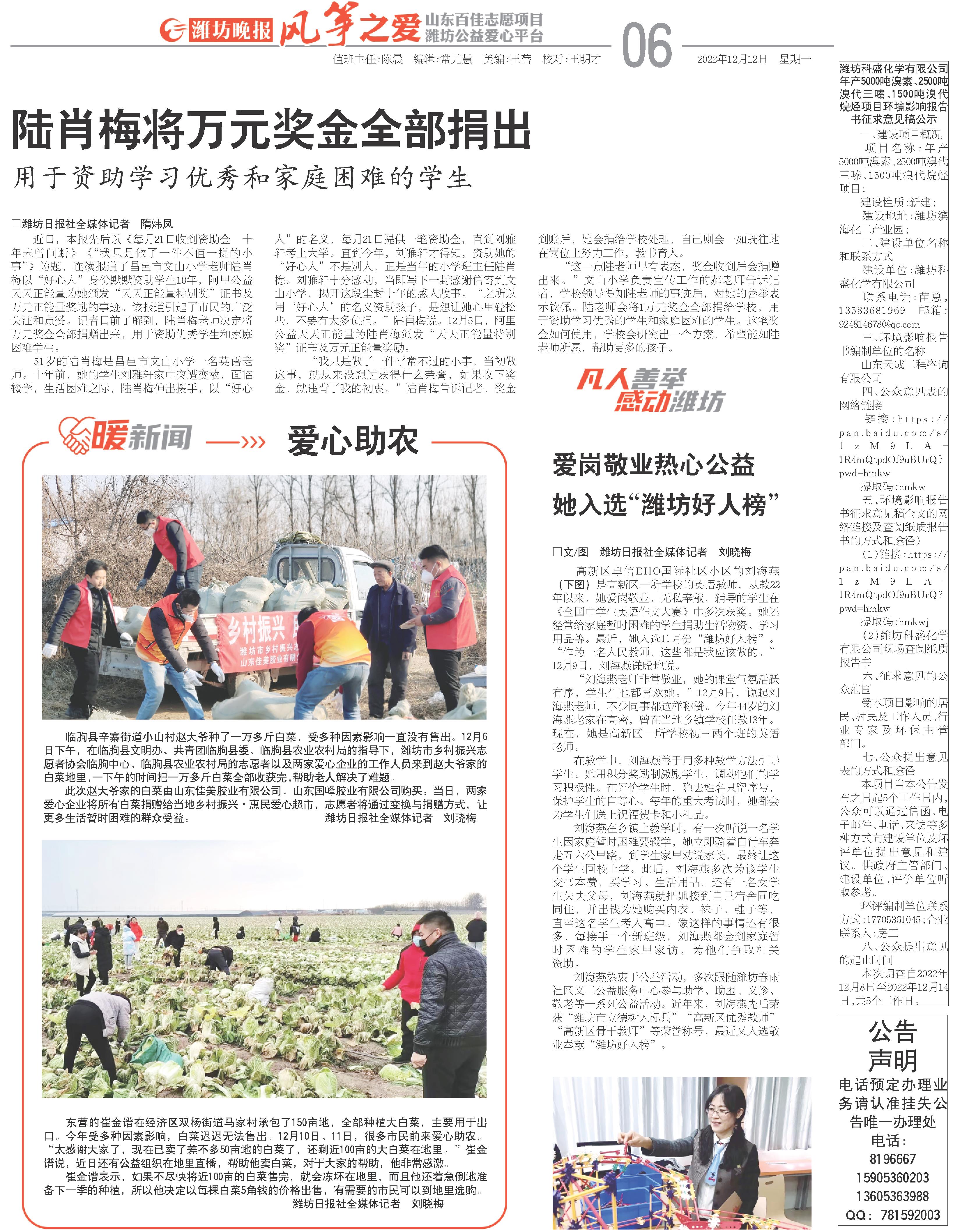 高新区卓信EHO国际社区小区的刘海燕(下图)是高新区一所学校的英语教师,从教22年以来,她爱岗敬业,无私奉献,辅导的学生在《全国中学生英语作文大赛》中多次获奖。她还经常给家庭暂时困难的学生捐助生活物资、学习用品等。最近,她入选11月份“潍坊好人榜”。“作为一名人民教师,这些都是我应该做的。”12月9日,刘海燕谦虚地说。