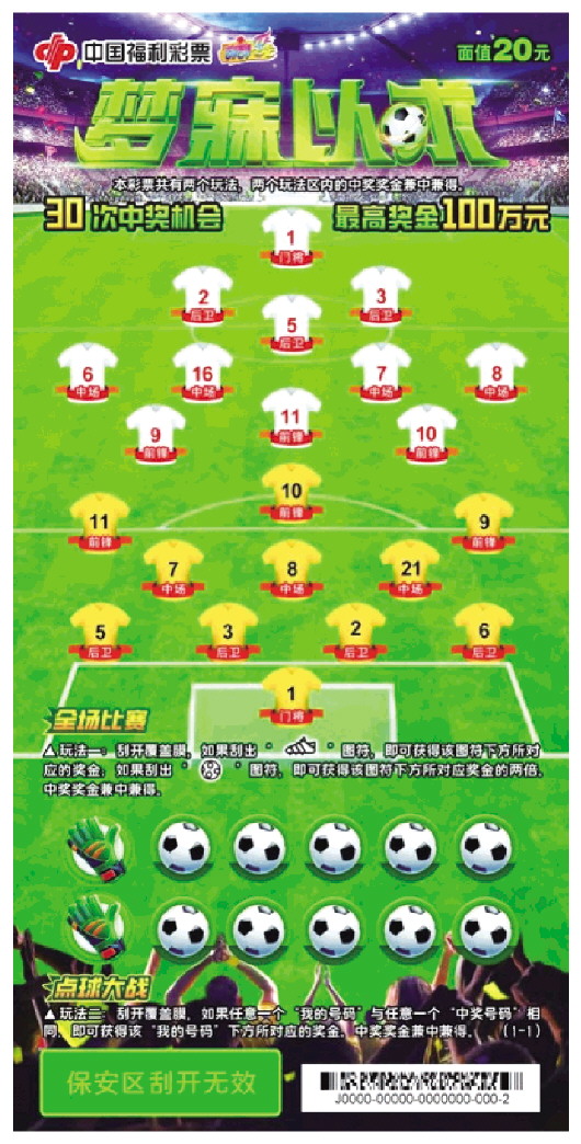 刮开覆盖膜,如果刮出“球鞋”图符,即可获得该图符下方所对应的奖金;如果刮出“足球”图符,即可获得该图符下方所对应奖金的两倍。中奖奖金兼中兼得。