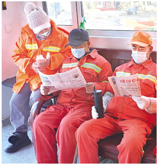 12月14日,潍城区西园街与怡园路交叉口的环卫驿站内,环卫工人们在读报小憩。近年来,我市持续推进环卫驿站建设,入冬以来,全市1039座环卫驿站给他们带来了温暖。 潍坊日报社全媒体记者 赵春晖