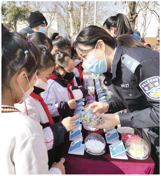 3月1日,潍城公安分局禁毒大队民警用仿真毒品向小学生宣传毒品的危害。当日,潍城区城关街道联合潍城公安分局禁毒大队来到增福堂社区,开展禁毒宣传活动,通过展示仿真毒品、发放禁毒宣传资料、以案释法的方式,深入浅出地讲解毒品的种类、毒品的危害、毒品的预防及相关法律法规等禁毒知识,提高社区居民防范意识,自觉抵制毒品危害。 潍坊日报社全媒体记者 张驰