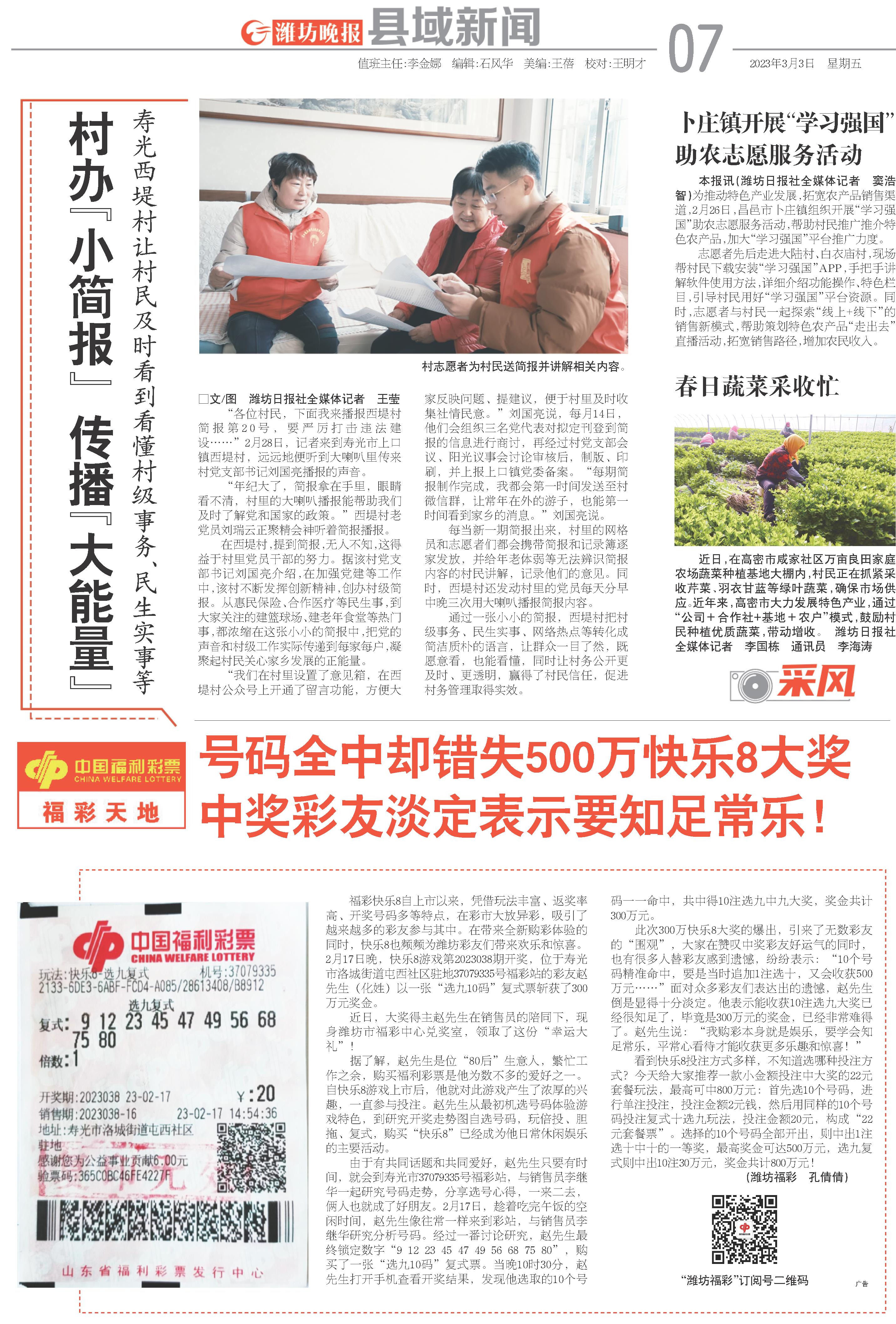 “各位村民,下面我来播报西堤村简报第20号,要严厉打击违法建设……”2月28日,记者来到寿光市上口镇西堤村,远远地便听到大喇叭里传来村党支部书记刘国亮播报的声音。