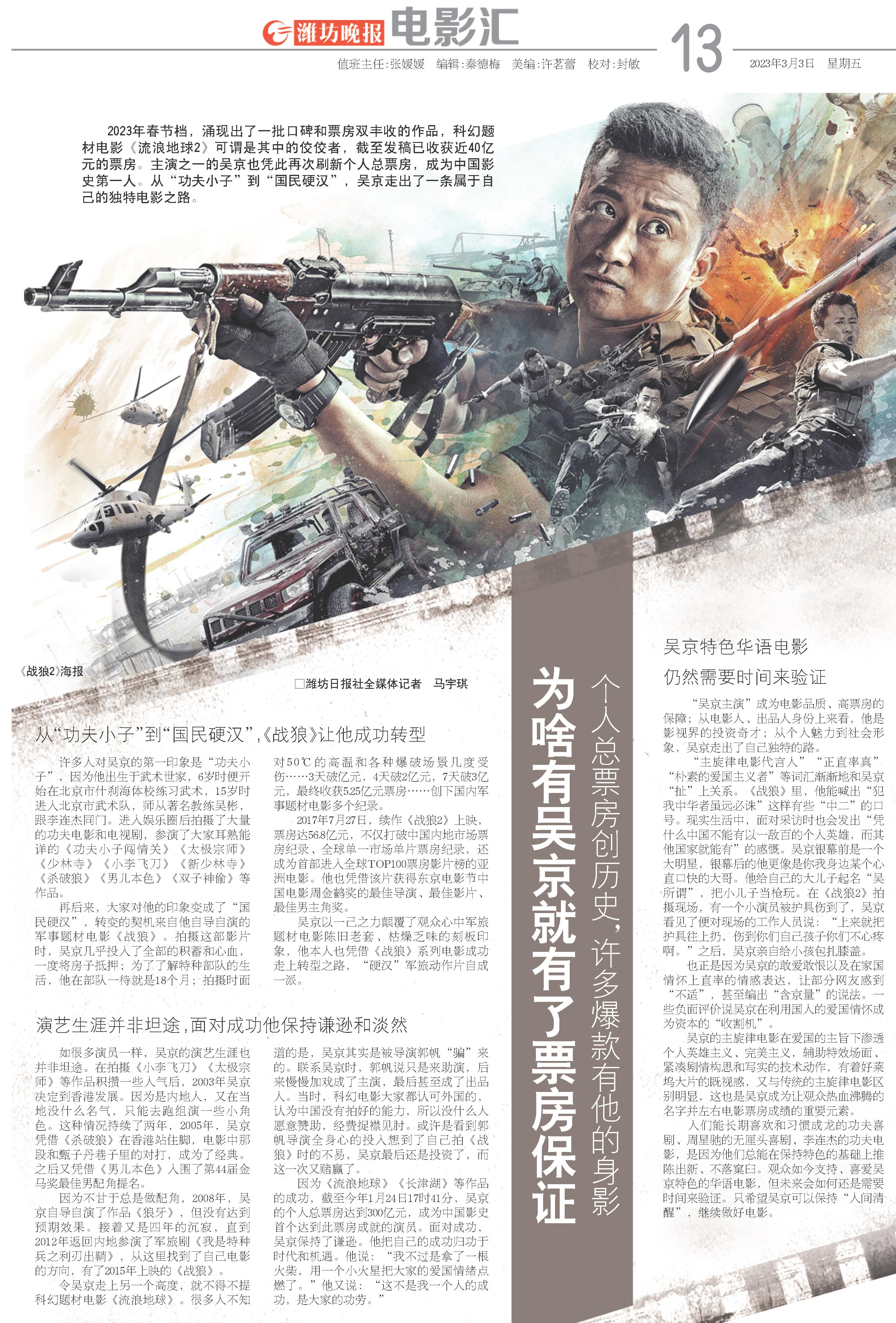 “吴京主演”成为电影品质、高票房的保障;从电影人、出品人身份上来看,他是影视界的投资奇才;从个人魅力到社会形象,吴京走出了自己独特的路。