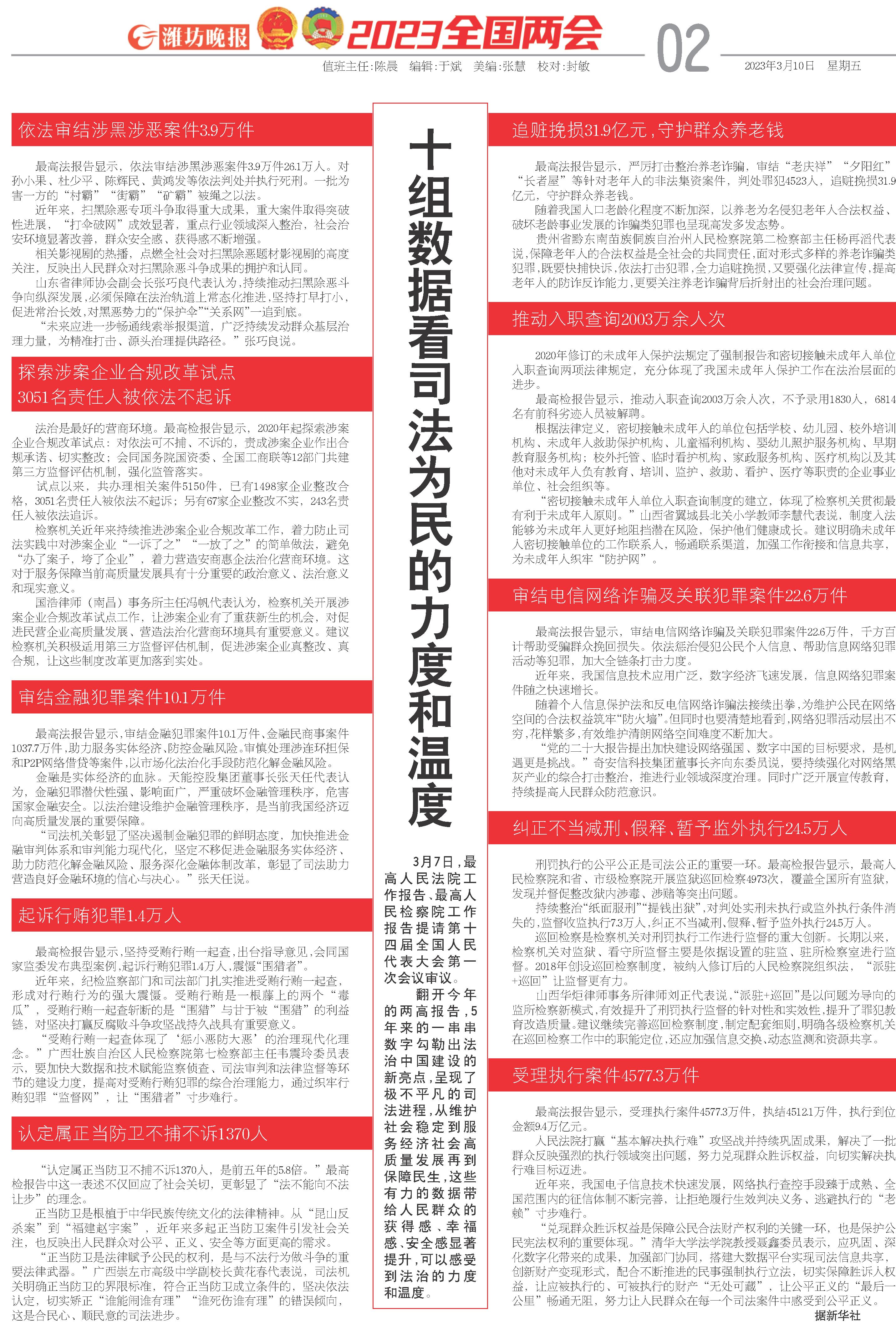 翻开今年的两高报告,5年来的一串串数字勾勒出法治中国建设的新亮点,呈现了极不平凡的司法进程,从维护社会稳定到服务经济社会高质量发展再到保障民生,这些有力的数据带给人民群众的获得感、幸福感、安全感显著提升,可以感受到法治的力度和温度。