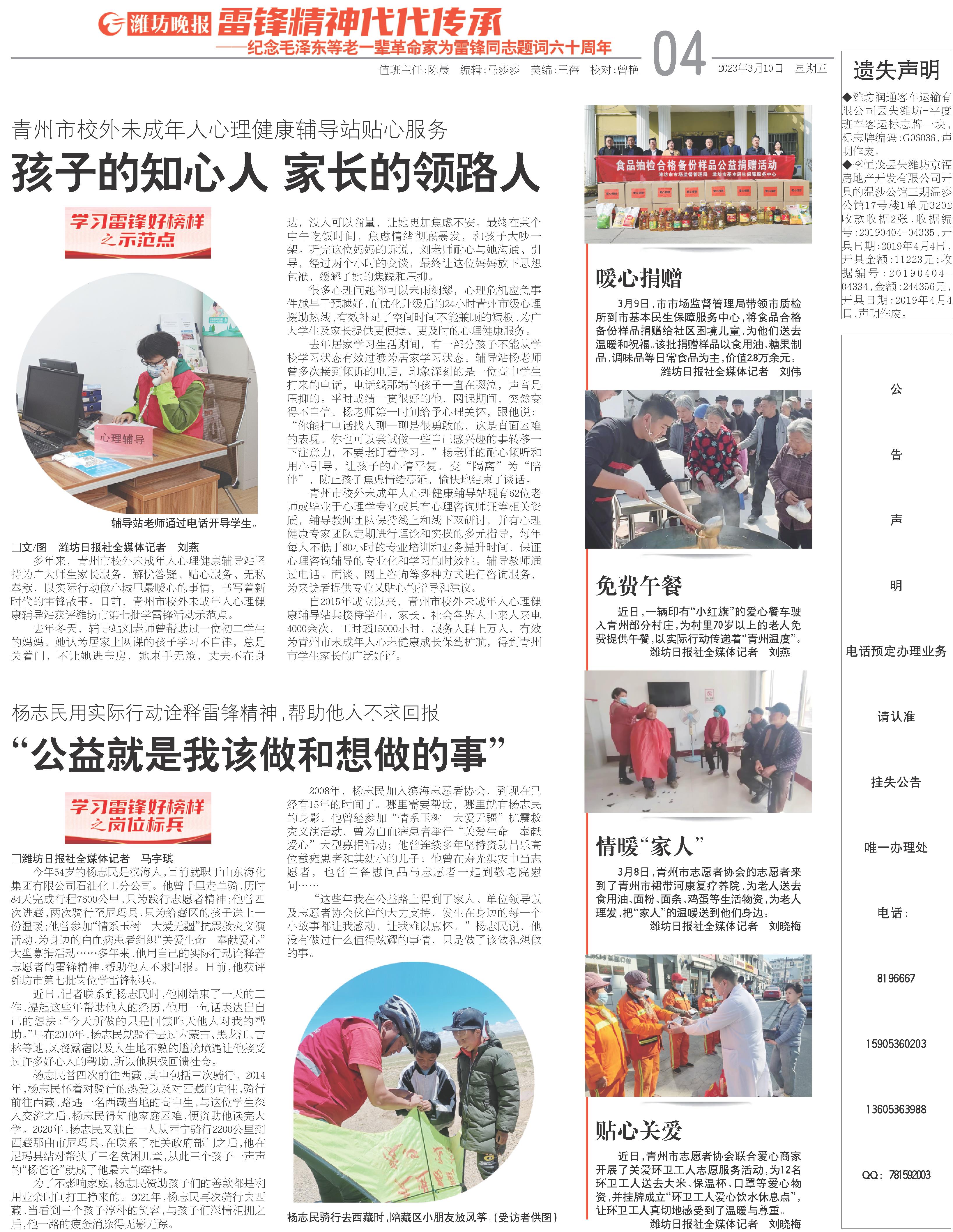 今年54岁的杨志民是滨海人,目前就职于山东海化集团有限公司石油化工分公司。他曾千里走单骑,历时84天完成行程7600公里,只为践行志愿者精神;他曾四次进藏,两次骑行至尼玛县,只为给藏区的孩子送上一份温暖;他曾参加“情系玉树 大爱无疆”抗震救灾义演活动,为身边的白血病患者组织“关爱生命 奉献爱心”大型募捐活动……多年来,他用自己的实际行动诠释着志愿者的雷锋精神,帮助他人不求回报。日前,他获评潍坊市第七批岗位学雷锋标兵。