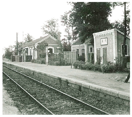 从现有的资料及老照片可以看出,当年的丈岭站舍较多,站名牌写在一间偏厦子小屋门上,偏厦子应是厕所,厕所上写站名,这也真让人想不通。好在山墙及正面,站名都有书写,人们不至于混淆。厕所旁边另有两间德建工作室,再往东去,才是行车室及候车室、检票口。档案馆内藏有的丈岭站老照片上多有植树,如今这些树木一棵也不见了。可惜,照片档案贴纸上“昭和”多少年,是空白的。不知当年日本人占领丈岭时,何时拍摄的这张照片。