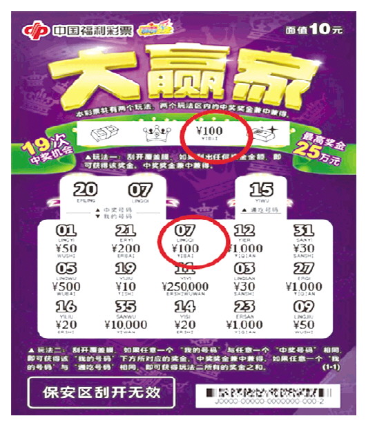 该款彩票单张面值10元,最高奖金25万元,10个奖级,19次中奖机会,奖金返还率为65%。