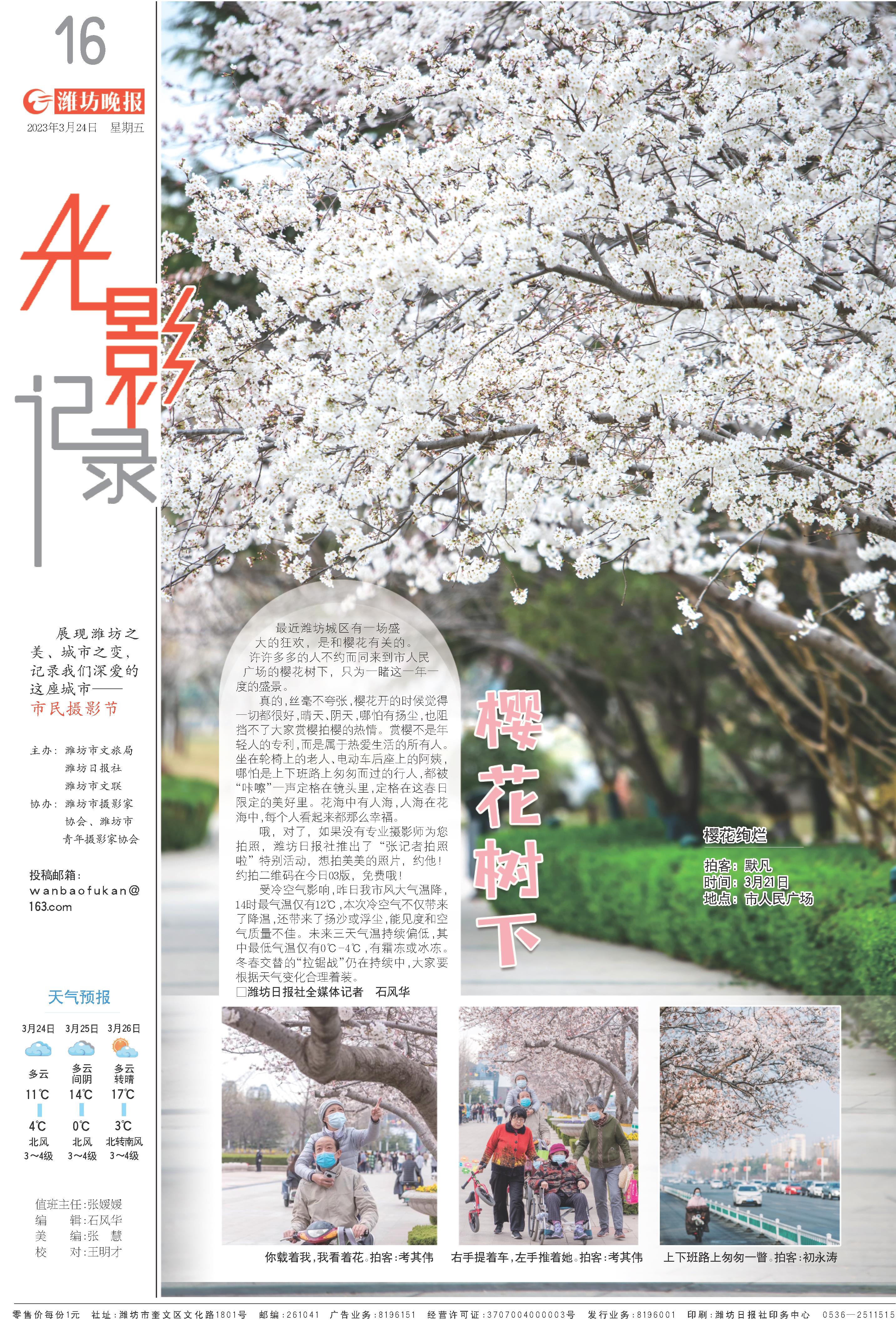 最近潍坊城区有一场盛大的狂欢,是和樱花有关的。许许多多的人不约而同来到市人民广场的樱花树下,只为一睹这一年一度的盛景。