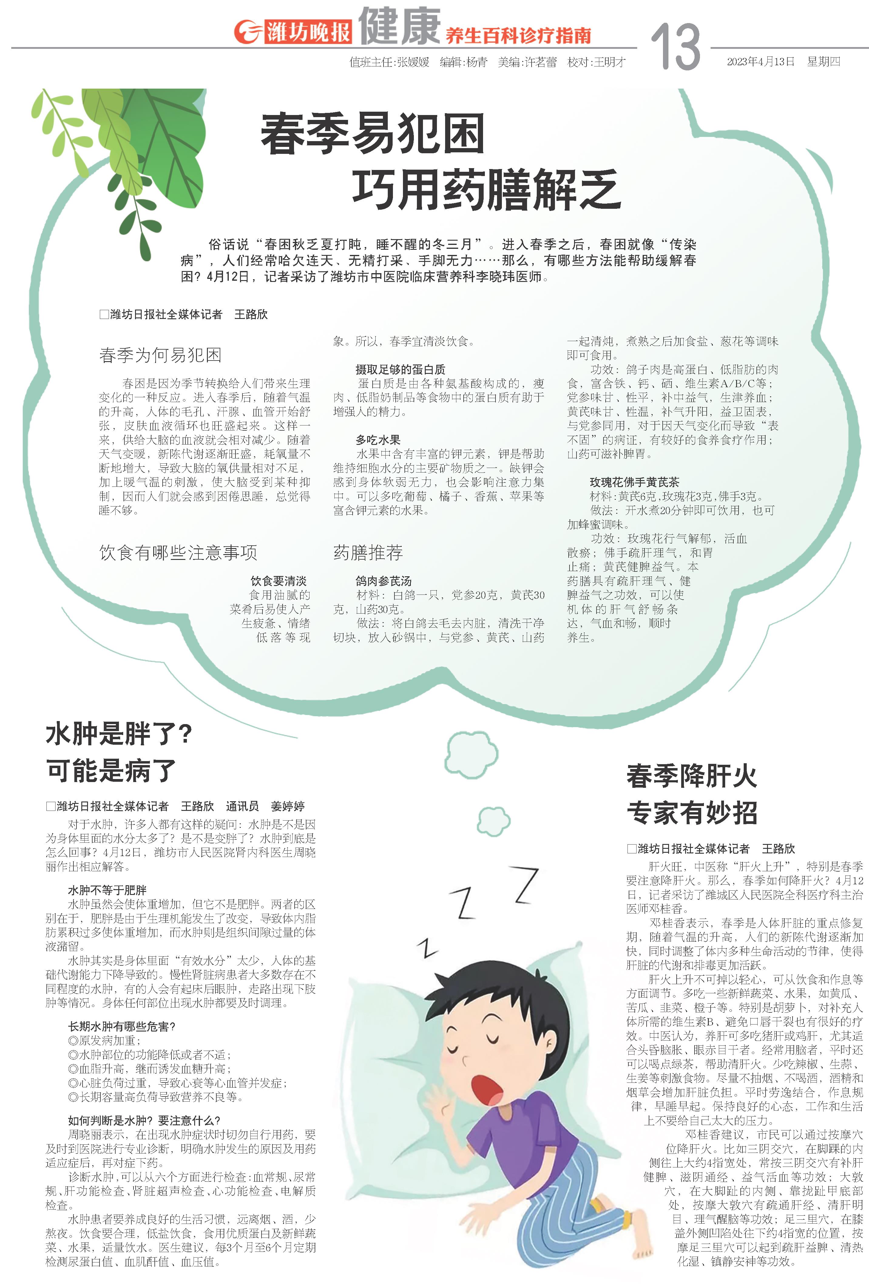 俗话说“春困秋乏夏打盹,睡不醒的冬三月”。进入春季之后,春困就像“传染病”,人们经常哈欠连天、无精打采、手脚无力……那么,有哪些方法能帮助缓解春困?4月12日,记者采访了潍坊市中医院临床营养科李晓玮医师。