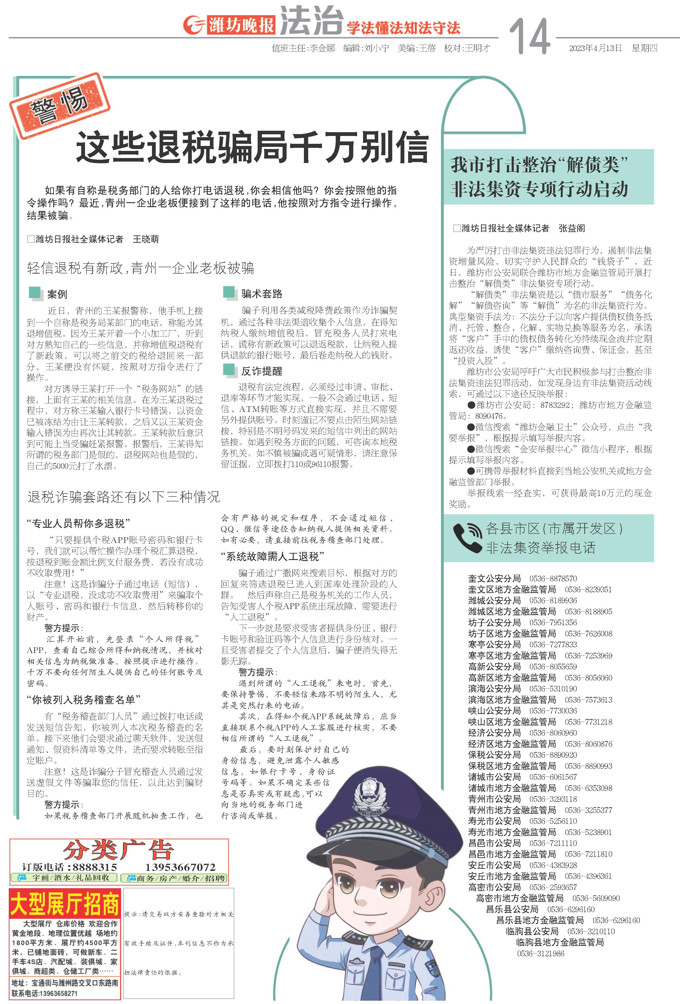 ●潍坊市公安局:8783292;潍坊市地方金融监管局:8090476。