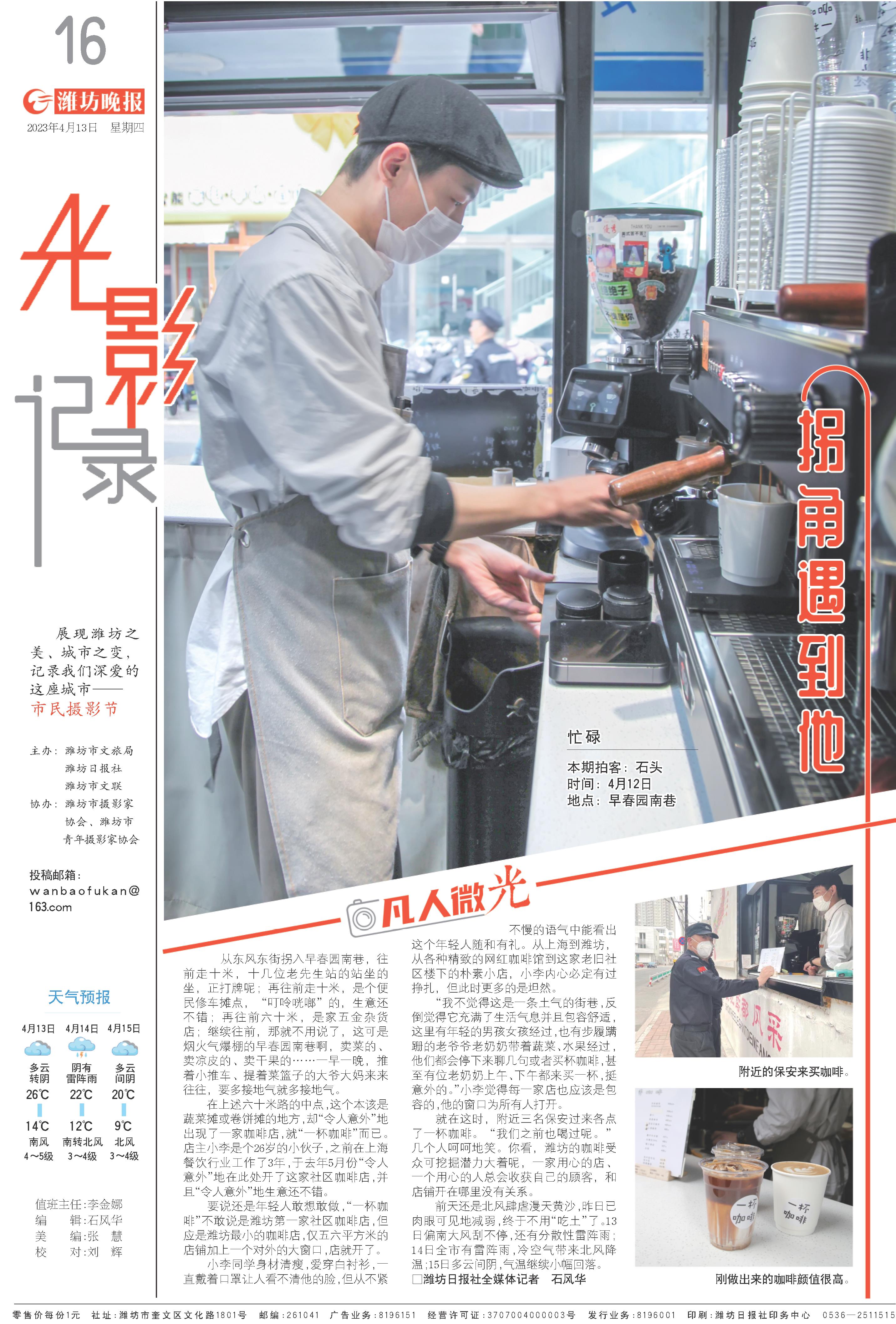 要说还是年轻人敢想敢做,“一杯咖啡”不敢说是潍坊第一家社区咖啡店,但应是潍坊最小的咖啡店,仅五六平方米的店铺加上一个对外的大窗口,店就开了。