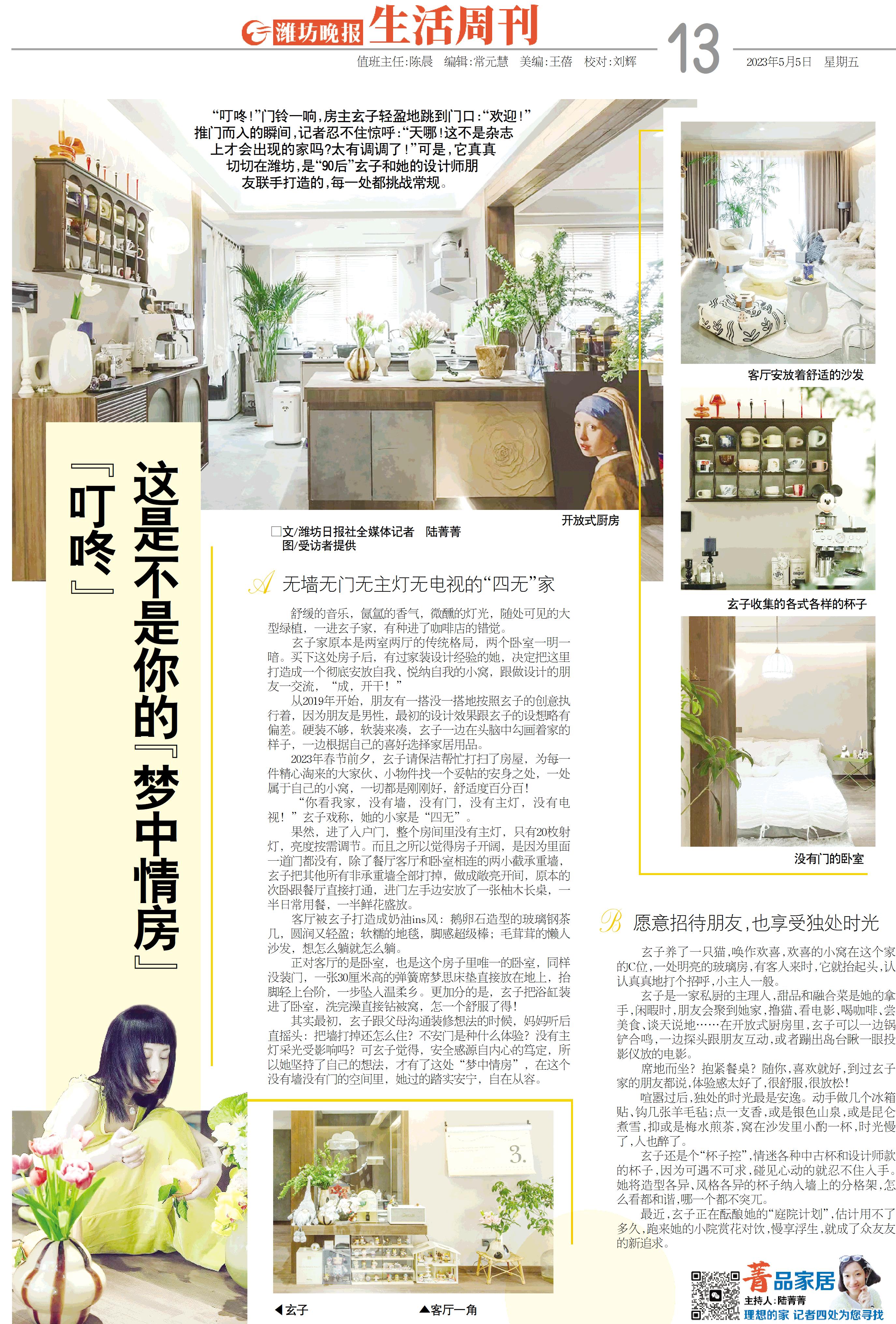 “叮咚!”门铃一响,房主玄子轻盈地跳到门口:“欢迎!”推门而入的瞬间,记者忍不住惊呼:“天哪!这不是杂志上才会出现的家吗?太有调调了!”可是,它真真切切在潍坊,是“90后”玄子和她的设计师朋友联手打造的,每一处都挑战常规。
