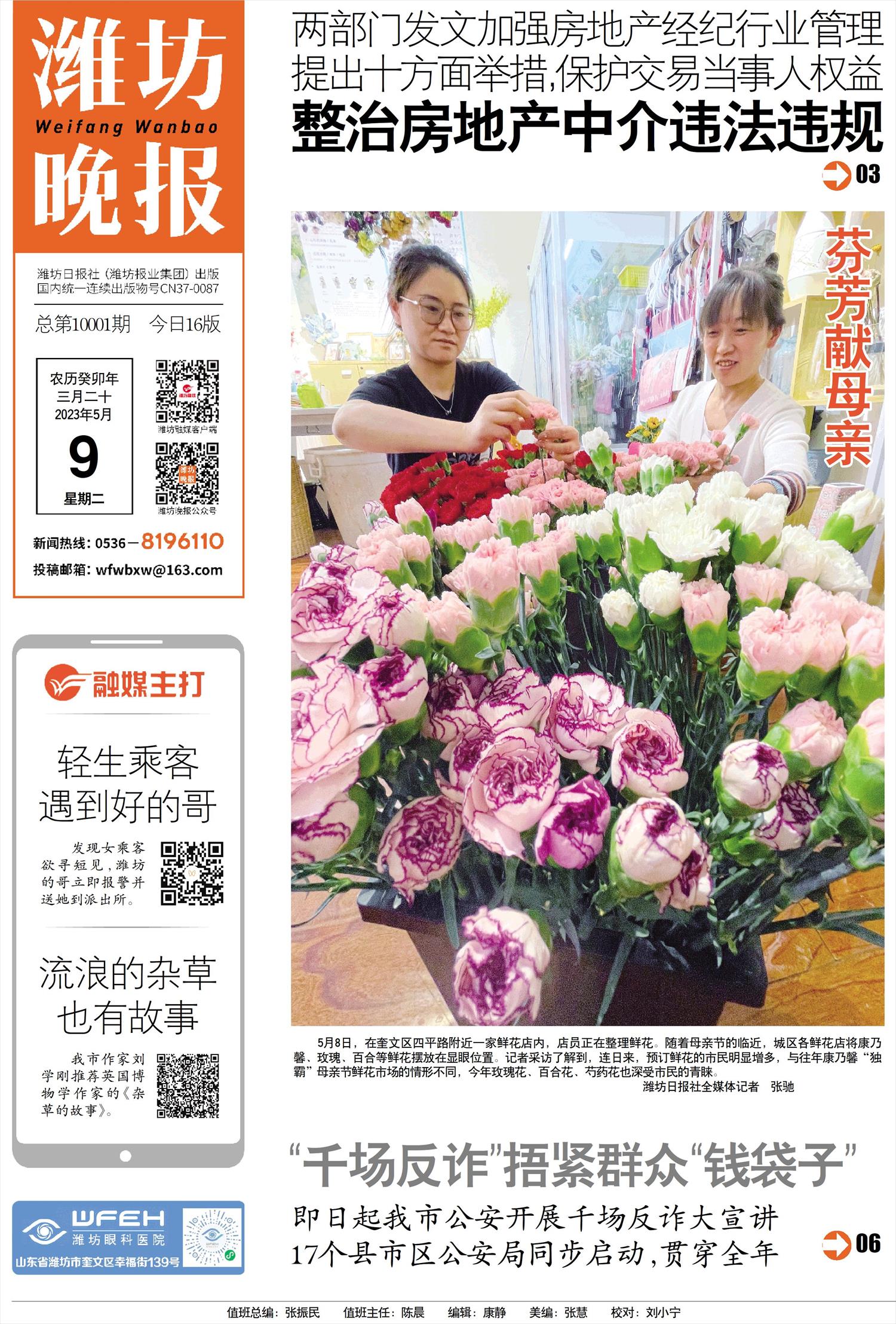 5月8日,在奎文区四平路附近一家鲜花店内,店员正在整理鲜花。随着母亲节的临近,城区各鲜花店将康乃馨、玫瑰、百合等鲜花摆放在显眼位置。记者采访了解到,连日来,预订鲜花的市民明显增多,与往年康乃馨“独霸”母亲节鲜花市场的情形不同,今年玫瑰花、百合花、芍药花也深受市民的青睐。