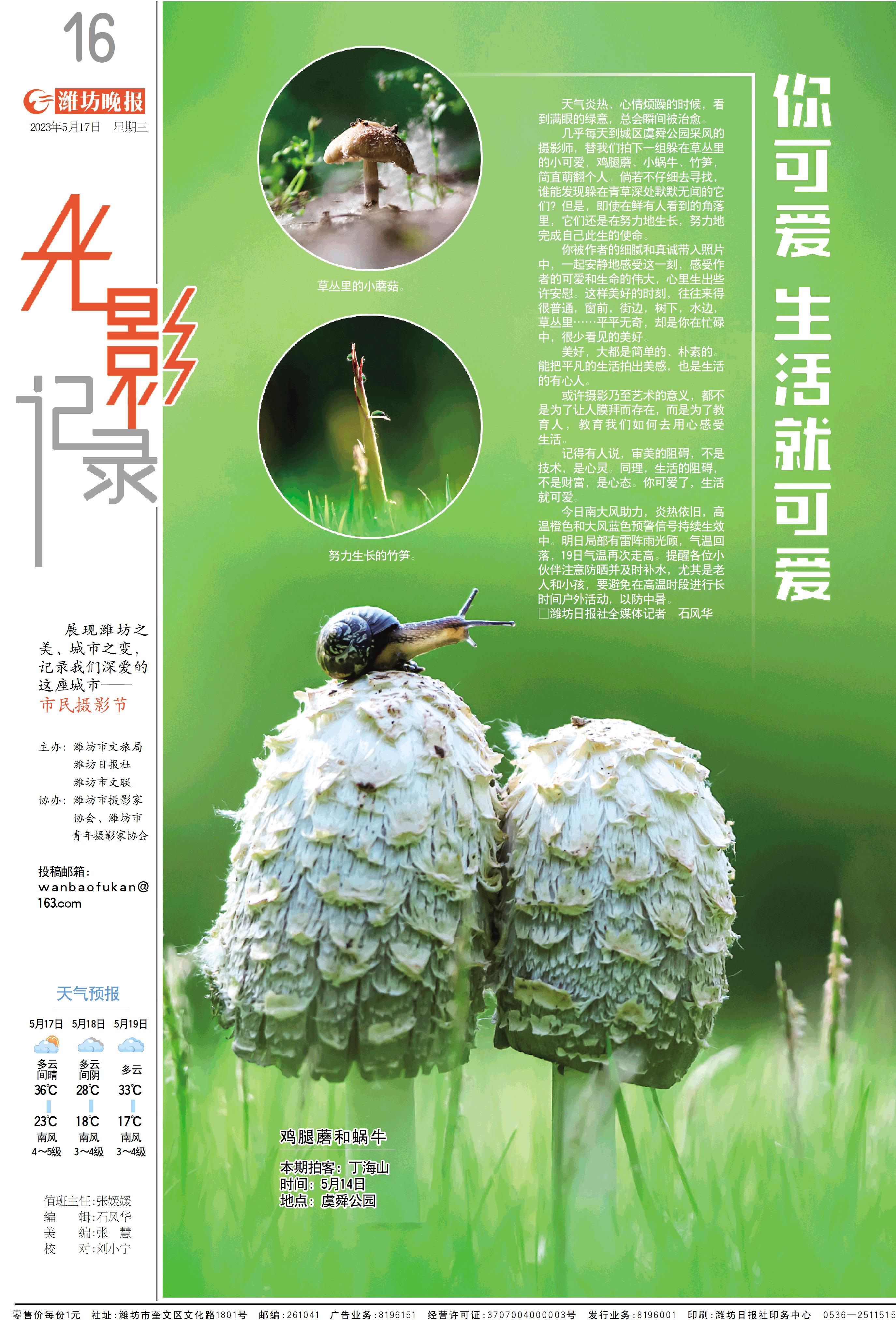 几乎每天到城区虞舜公园采风的摄影师,替我们拍下一组躲在草丛里的小可爱,鸡腿蘑、小蜗牛、竹笋,简直萌翻个人。倘若不仔细去寻找,谁能发现躲在青草深处默默无闻的它们?但是,即使在鲜有人看到的角落里,它们还是在努力地生长,努力地完成自己此生的使命。