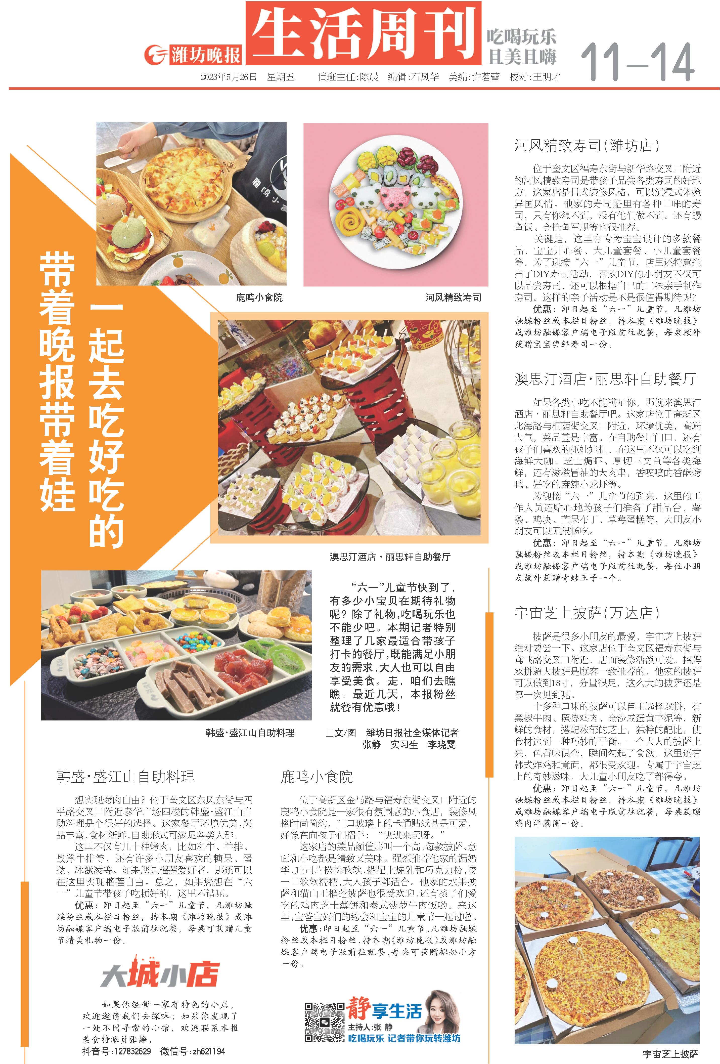优惠:即日起至“六一”儿童节,凡潍坊融媒粉丝或本栏目粉丝,持本期《潍坊晚报》或潍坊融媒客户端电子版前往就餐,每桌可获赠儿童节精美礼物一份。