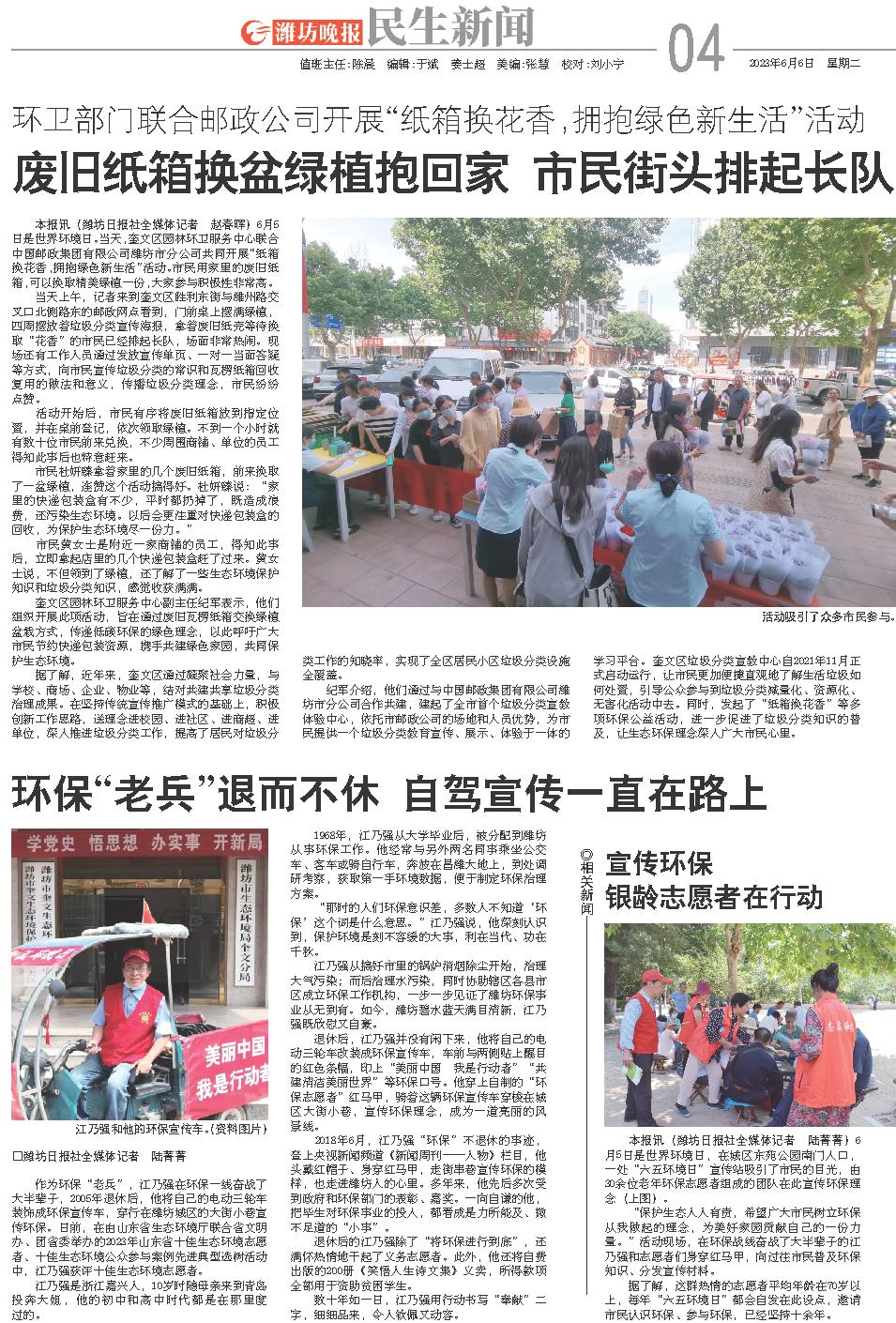 本报讯(潍坊日报社全媒体记者 赵春晖)6月5日是世界环境日。当天,奎文区园林环卫服务中心联合中国邮政集团有限公司潍坊市分公司共同开展“纸箱换花香,拥抱绿色新生活”活动。市民用家里的废旧纸箱,可以换取精美绿植一份,大家参与积极性非常高。