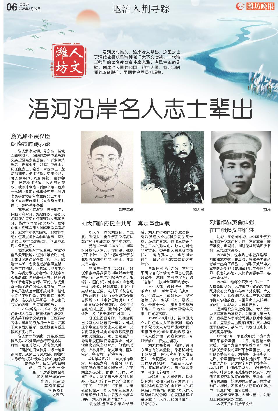 浯河历史悠久,沿岸贤人辈出。这里走出了清代被嘉庆皇帝御赐“天下文官祖、一代帝王师”的著名教育泰斗窦光鼐,有民主革命先驱、创建“大同共和国”的刘大同,有北伐时期的革命烈士、早期共产党员刘增等。