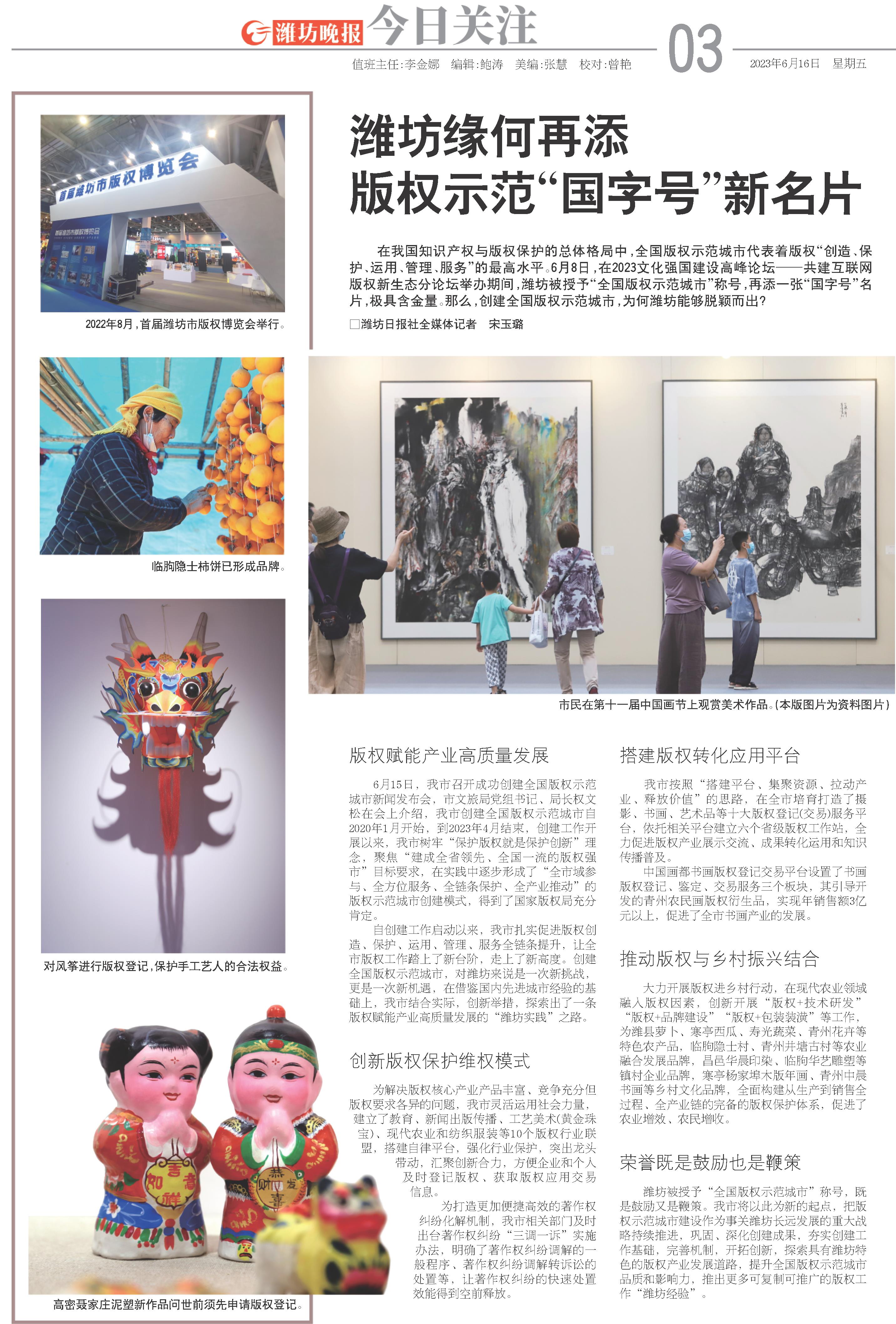 在我国知识产权与版权保护的总体格局中,全国版权示范城市代表着版权“创造、保护、运用、管理、服务”的最高水平。6月8日,在2023文化强国建设高峰论坛——共建互联网版权新生态分论坛举办期间,潍坊被授予“全国版权示范城市”称号,再添一张“国字号”名片,极具含金量。那么,创建全国版权示范城市,为何潍坊能够脱颖而出?
