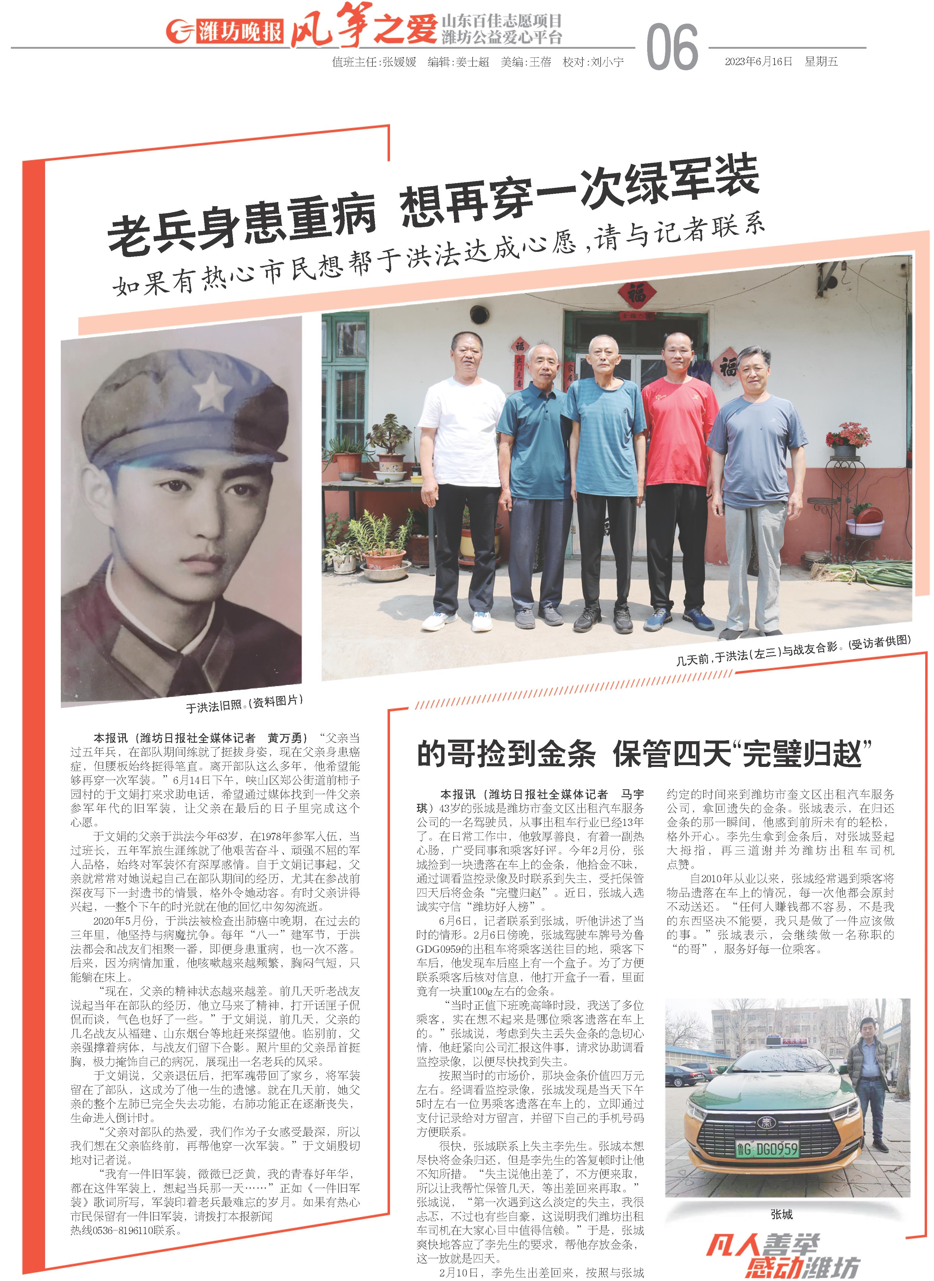 本报讯(潍坊日报社全媒体记者 黄万勇)“父亲当过五年兵,在部队期间练就了挺拔身姿,现在父亲身患癌症,但腰板始终挺得笔直。离开部队这么多年,他希望能够再穿一次军装。”6月14日下午,峡山区郑公街道前柿子园村的于文娟打来求助电话,希望通过媒体找到一件父亲参军年代的旧军装,让父亲在最后的日子里完成这个心愿。