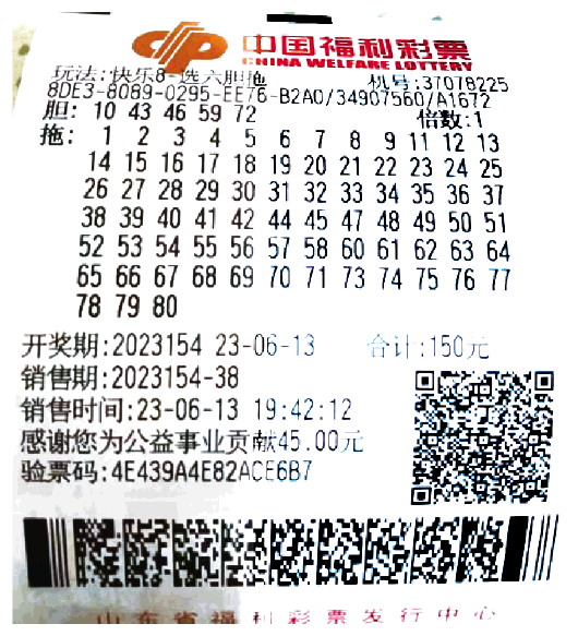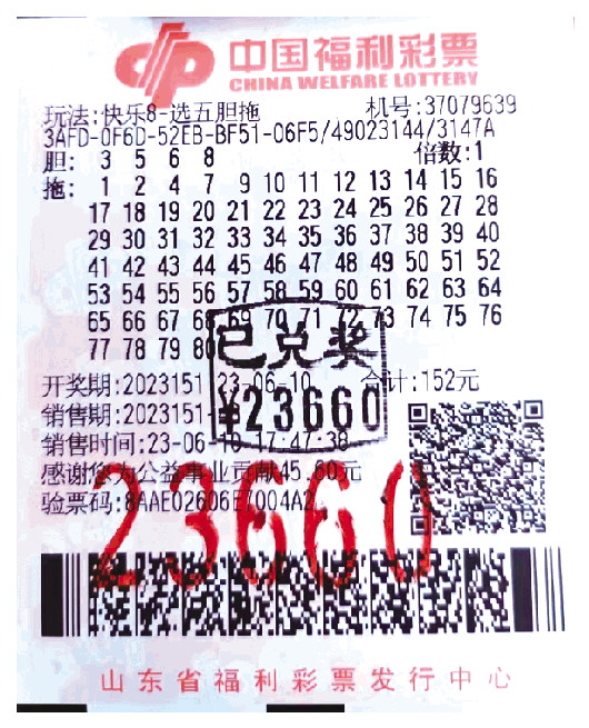 “快乐8”“选五四胆全拖”玩法一直是购彩者们获奖的利器,昌邑市37079639号福彩站彩友在“快乐8”第2023151期中得“选五四胆全拖”奖,加上派奖奖金,共揽获23660元。