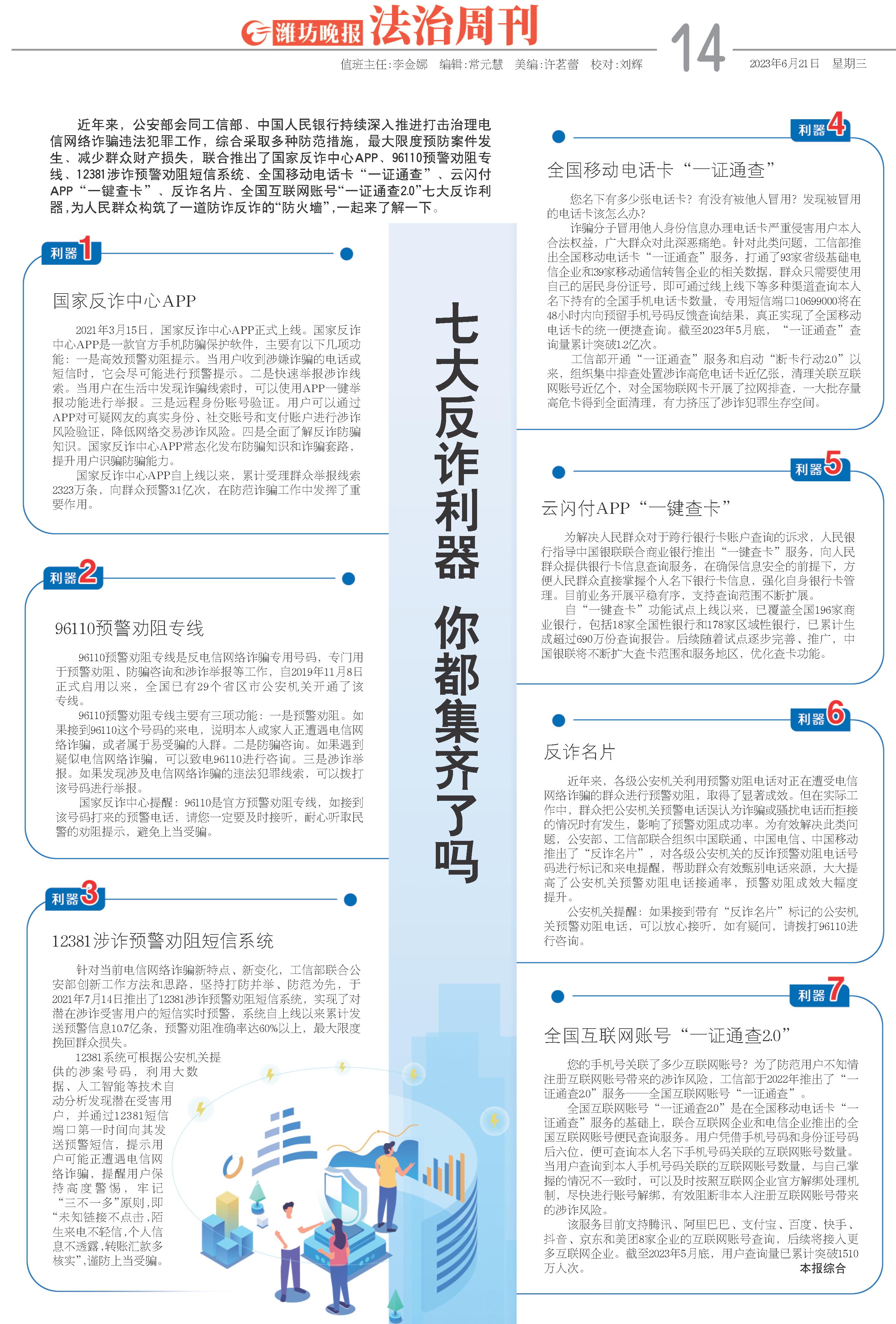 近年来,公安部会同工信部、中国人民银行持续深入推进打击治理电信网络诈骗违法犯罪工作,综合采取多种防范措施,最大限度预防案件发生、减少群众财产损失,联合推出了国家反诈中心APP、96110预警劝阻专线、12381涉诈预警劝阻短信系统、全国移动电话卡“一证通查”、云闪付APP“一键查卡”、反诈名片、全国互联网账号“一证通查2.0”七大反诈利器,为人民群众构筑了一道防诈反诈的“防火墙”,一起来了解一下。