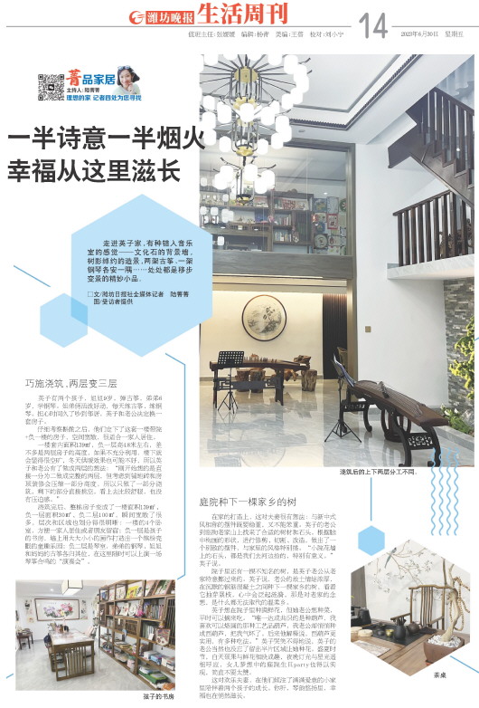 走进英子家,有种错入音乐室的感觉——文化石的背景墙,树影绰约的造景,两架古筝、一架钢琴各安一隅……处处都是移步变景的精妙小品。