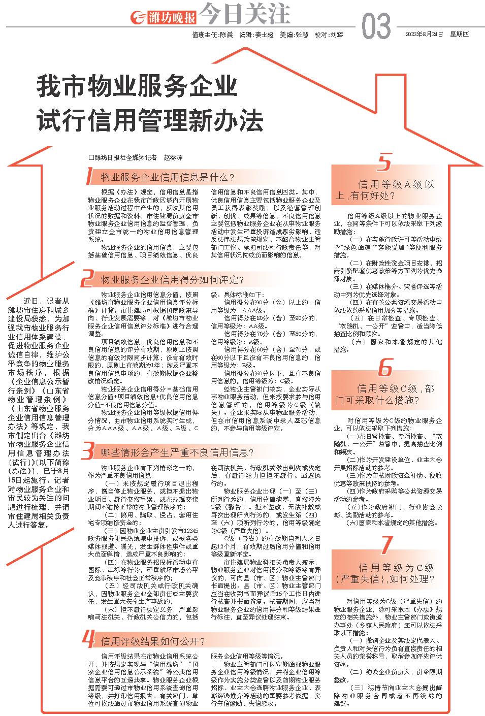 近日,记者从潍坊市住房和城乡建设局获悉,为加强我市物业服务行业信用体系建设,促进物业服务企业诚信自律,维护公平竞争的物业服务市场秩序,根据《企业信息公示暂行条例》《山东省物业管理条例》《山东省物业服务企业信用信息管理办法》等规定,我市制定出台《潍坊市物业服务企业信用信息管理办法(试行)》(以下简称《办法》),已于8月15日起施行。记者对物业服务企业和市民较为关注的问题进行梳理,并请市住建局相关负责人进行答复。