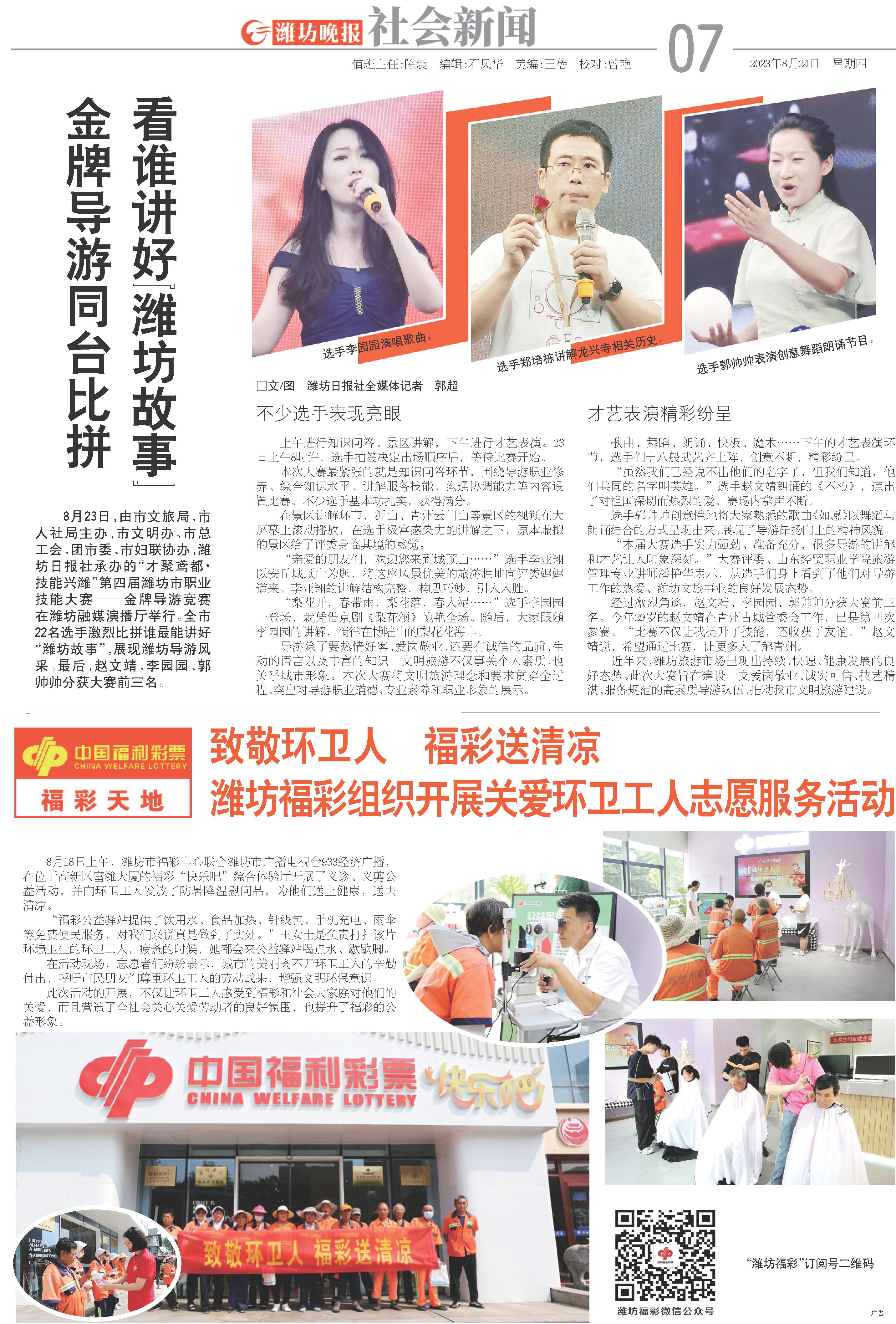 8月23日,由市文旅局、市人社局主办,市文明办、市总工会、团市委、市妇联协办,潍坊日报社承办的“才聚鸢都·技能兴潍”第四届潍坊市职业技能大赛——金牌导游竞赛在潍坊融媒演播厅举行。全市22名选手激烈比拼谁最能讲好“潍坊故事”,展现潍坊导游风采。最后,赵文靖、李园园、郭帅帅分获大赛前三名。