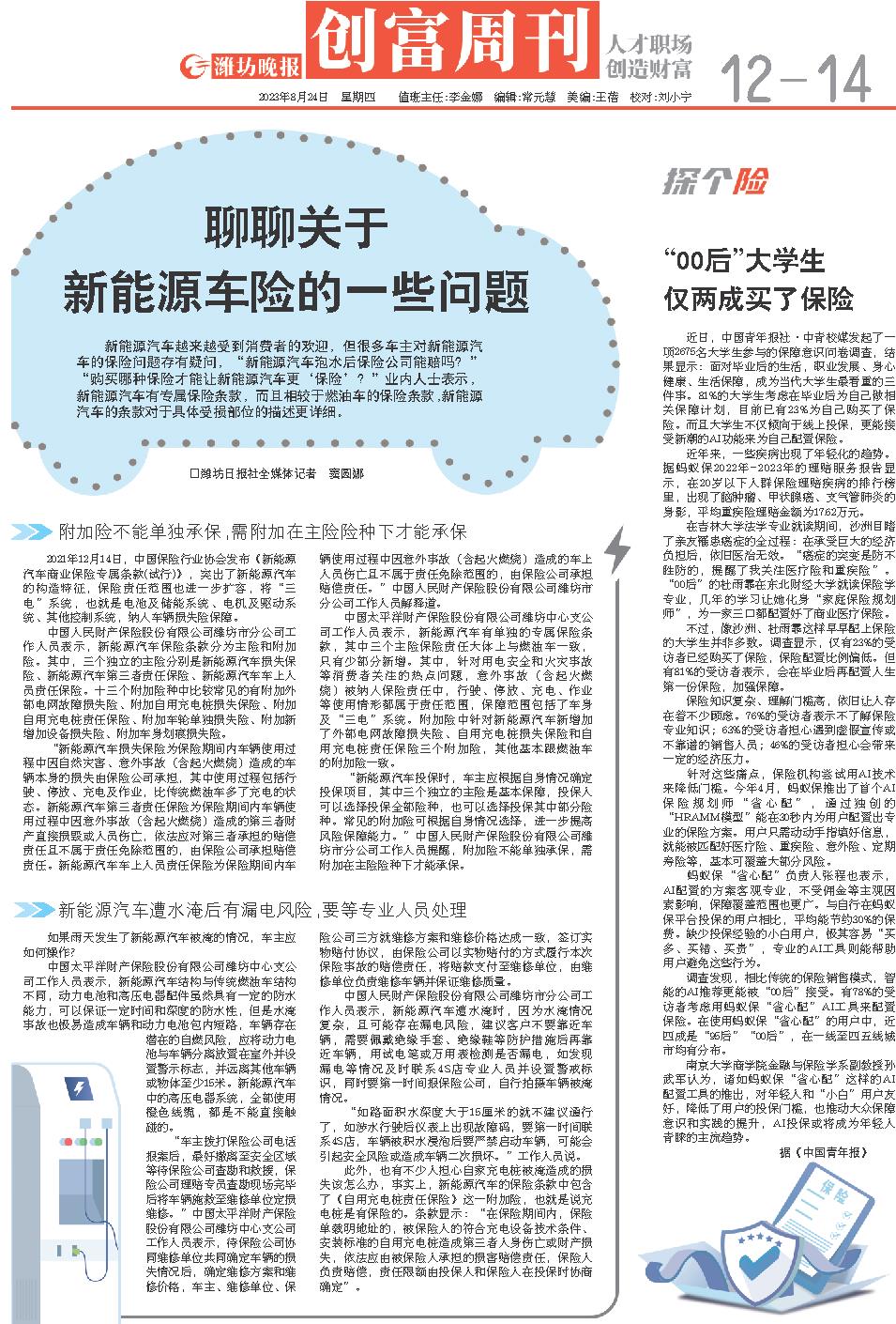 “新能源汽车投保时,车主应根据自身情况确定投保项目,其中三个独立的主险是基本保障,投保人可以选择投保全部险种,也可以选择投保其中部分险种。常见的附加险可根据自身情况选择,进一步提高风险保障能力。”中国人民财产保险股份有限公司潍坊市分公司工作人员提醒,附加险不能单独承保,需附加在主险险种下才能承保。