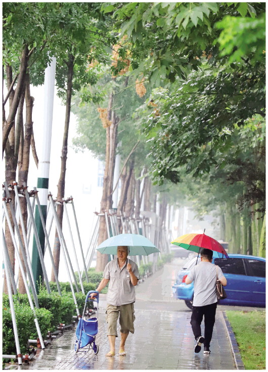8月27日,在城区东方路,行人在雨中撑伞出行,感受初秋清爽。当日,受气旋影响,我市出现明显降雨过程,午后最高气温仅有21℃。据市气象台预报,今日全市有中雨,南部有大到暴雨并伴有偏北大风,大风黄色预警信号生效中,需加强防范。 潍坊日报社全媒体记者 张驰