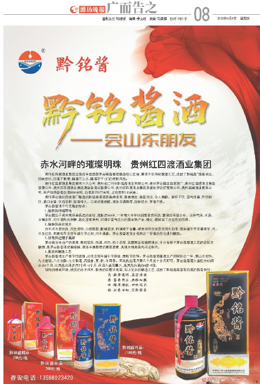 贵州茅台镇红四渡酒厂酿造的黔铭酱酒酒质晶亮透明,微有黄色,酱香突出,令人陶醉。敞杯不饮,香气扑鼻;开怀畅饮,满口生香;饮后空杯,留香持久。口味优雅细腻,酒体丰满醇厚,回味悠长,茅香不绝。