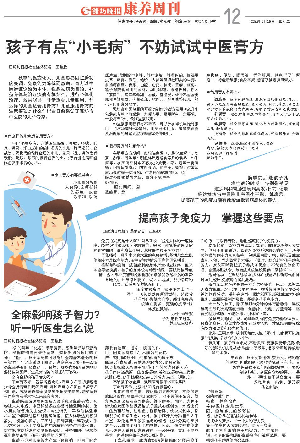 换季前后是孩子扎堆生病的时期,特别是呼吸道疾病和胃肠道疾病高发。日前,记者采访潍坊市中医院儿科医生王颖,她表示,提高孩子的免疫力能有效增强抵御病原体的能力。