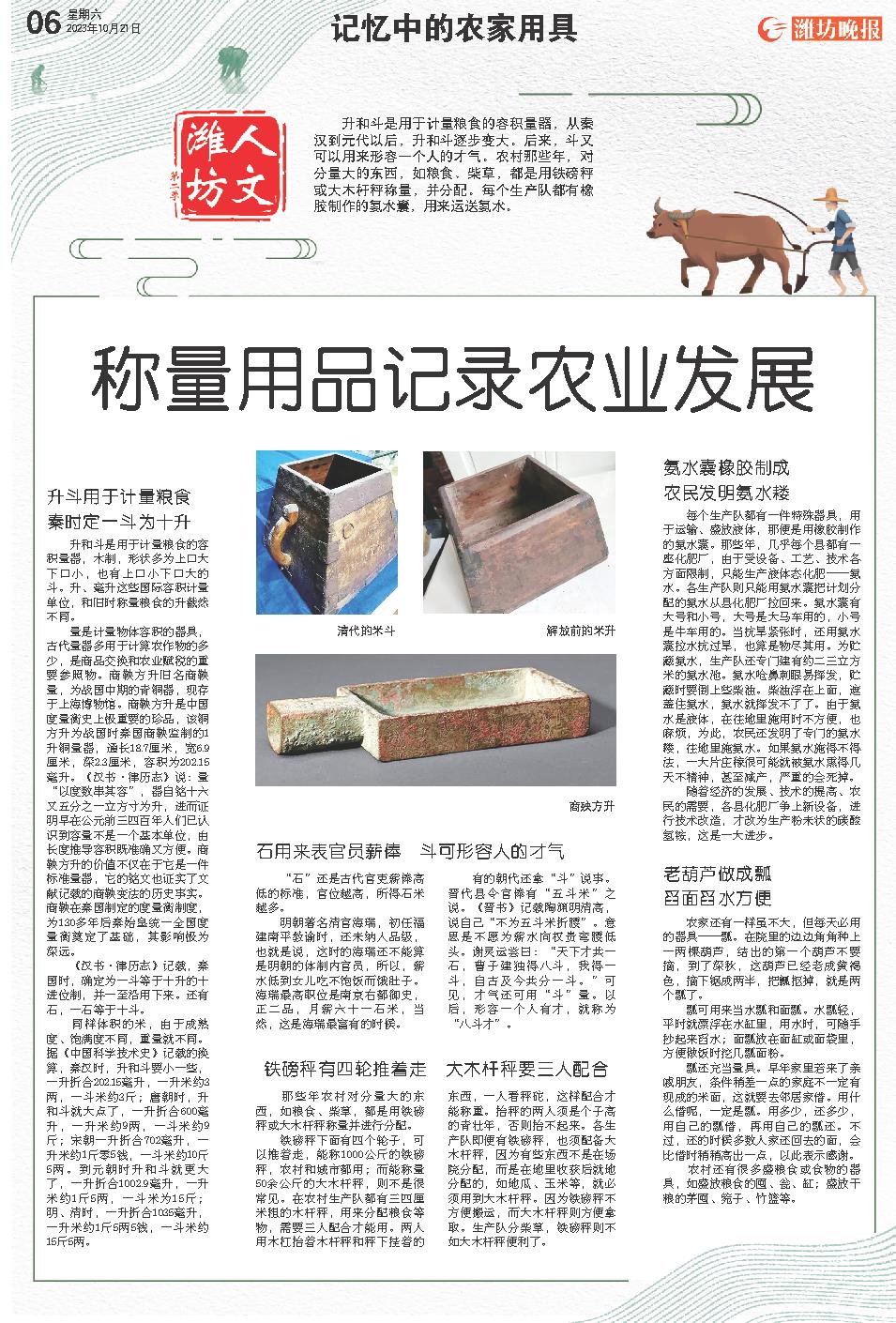 升和斗是用于计量粮食的容积量器,从秦汉到元代以后,升和斗逐步变大。后来,斗又可以用来形容一个人的才气。农村那些年,对分量大的东西,如粮食、柴草,都是用铁磅秤或大木杆秤称量,并分配。每个生产队都有橡胶制作的氨水囊,用来运送氨水。