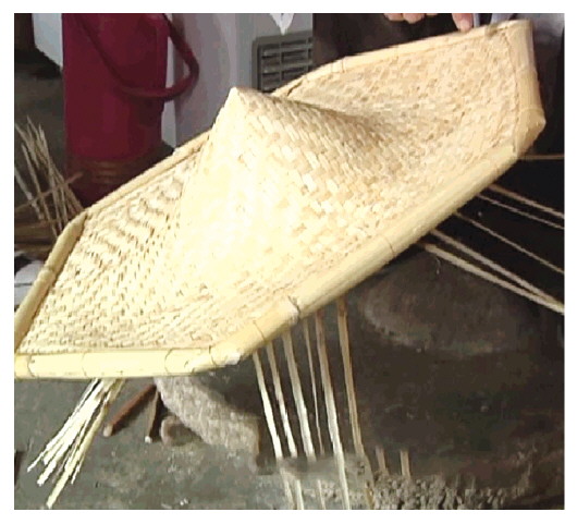 北方还多用麦秸编织草帽。草帽与苇笠有同样的功能:遮雨、遮阳。笔者见过用麦秸草编织草帽的过程。先把麦秸泡柔软,再像编小辫那样,六七根麦秸一起编,边编边接续麦秸,编成长长的麦秸小辫子。从帽顶开始,用麦秸小辫子一圈又一圈,叠加着从上往下,从里往外,边编边用针线固定好,一直到编成大小合适的一顶草帽为止。