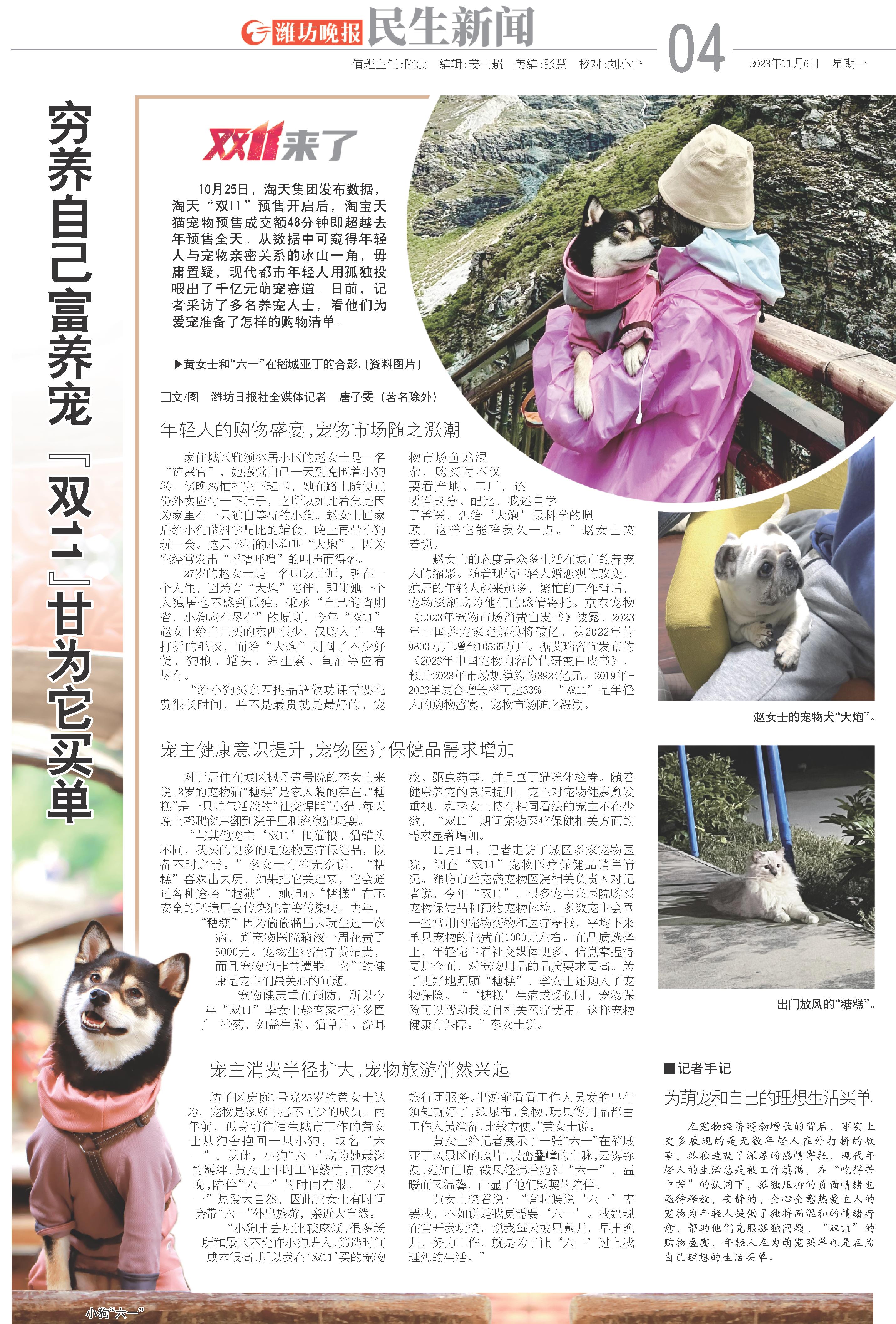 11月1日,记者走访了城区多家宠物医院,调查“双11”宠物医疗保健品销售情况。潍坊市益宠盛宠物医院相关负责人对记者说,今年“双11”,很多宠主来医院购买宠物保健品和预约宠物体检,多数宠主会囤一些常用的宠物药物和医疗器械,平均下来单只宠物的花费在1000元左右。在品质选择上,年轻宠主看社交媒体更多,信息掌握得更加全面,对宠物用品的品质要求更高。为了更好地照顾“糖糕”,李女士还购入了宠物保险。“‘糖糕’生病或受伤时,宠物保险可以帮助我支付相关医疗费用,这样宠物健康有保障。”李女士说。