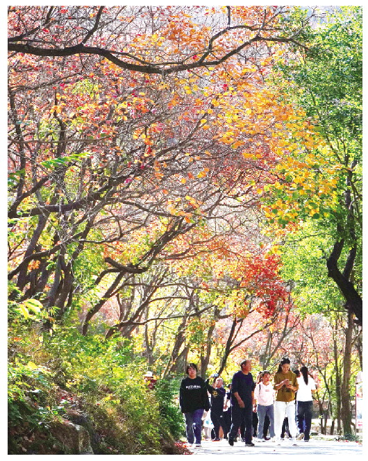 11月2日,游客在山东省潍坊市临朐县石门坊景区内观赏红叶。金秋时节,临朐县石门坊景区内红叶漫山,层林尽染,吸引游客前来观赏游玩。