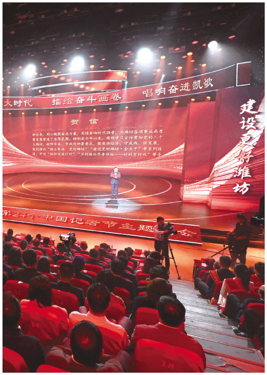 11月8日晚,奋斗——潍坊市庆祝第24个中国记者节主题晚会在市广播电视台举行。晚会分为坚守、创新、逐梦3个篇章,展示了全市新闻工作者与时代同行、与城市发展同步、与党和人民同心奋斗的信心决心,展现了服务中心大局、建设更好潍坊的奋进风采。会上,宣读了市委、市政府贺信,与会领导为2023年度潍坊市优秀记者和2020—2023年驻潍院校创新发展十大成果颁奖。 潍坊日报社全媒体记者 王晓光
