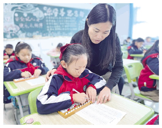 书玉盘方寸,看珠落乾坤。11月15日,潍城区北关街办中心小学三年级二班珠心算课程上,学生们正在认真计算。