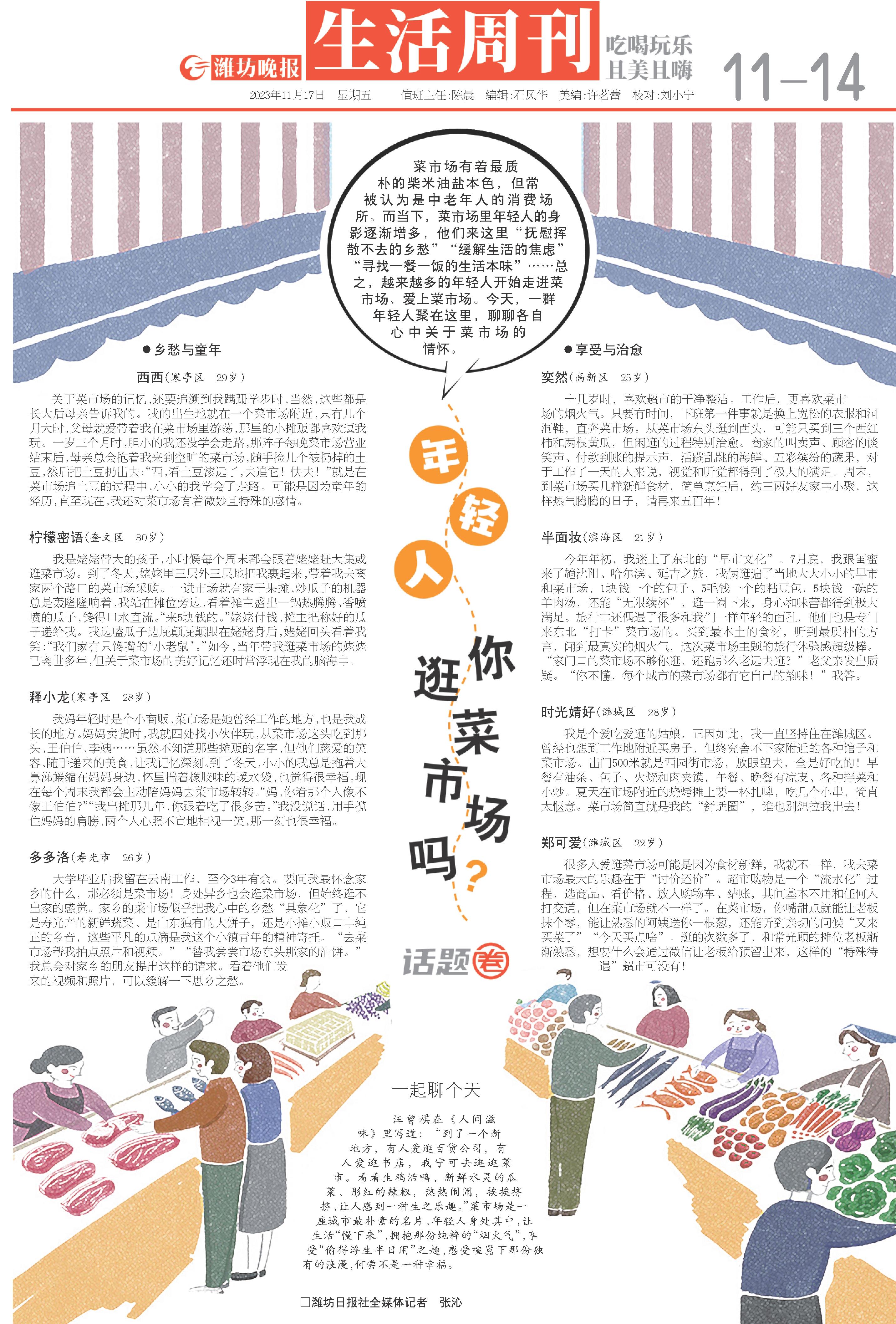 菜市场有着最质朴的柴米油盐本色,但常被认为是中老年人的消费场所。而当下,菜市场里年轻人的身影逐渐增多,他们来这里“抚慰挥散不去的乡愁”“缓解生活的焦虑”“寻找一餐一饭的生活本味”……总之,越来越多的年轻人开始走进菜市场、爱上菜市场。今天,一群年轻人聚在这里,聊聊各自心中关于菜市场的情怀。
