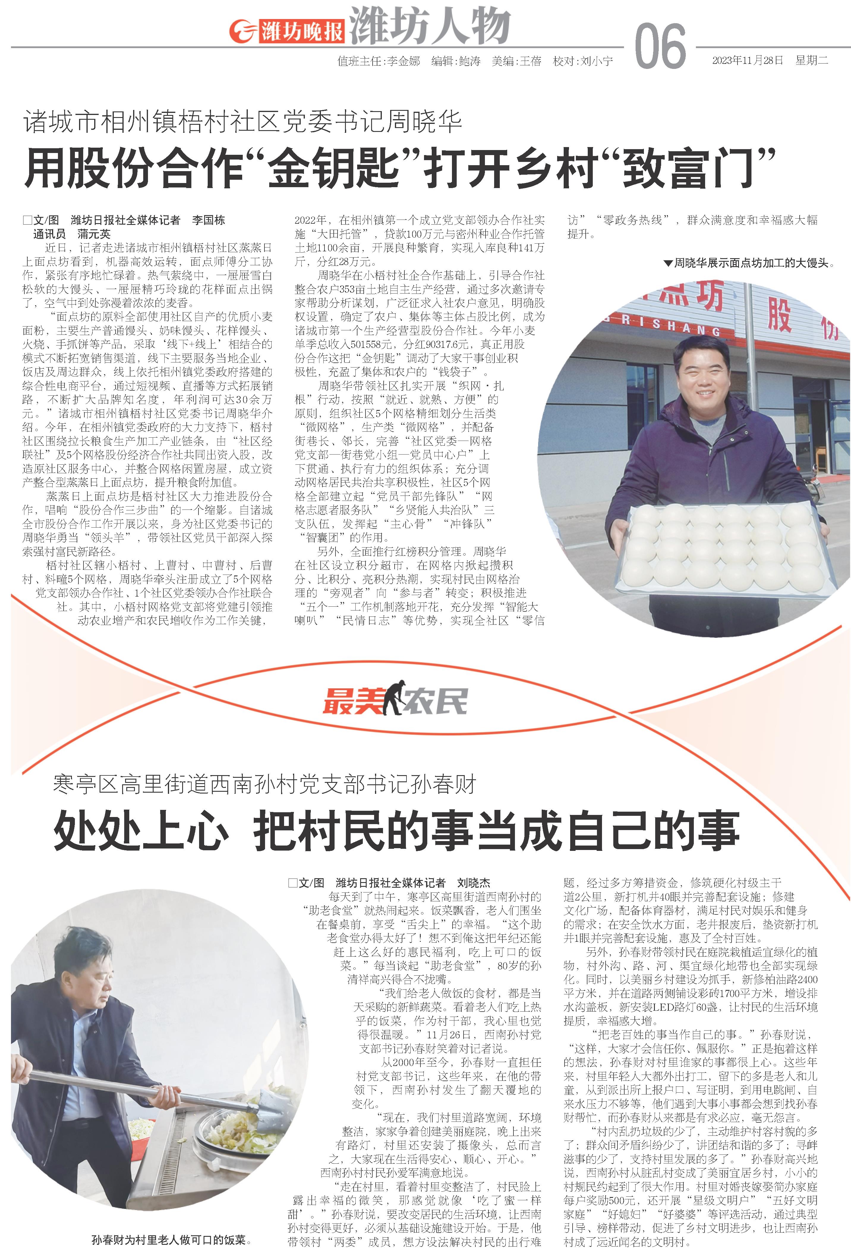 周晓华在小梧村社企合作基础上,引导合作社整合农户353亩土地自主生产经营,通过多次邀请专家帮助分析谋划,广泛征求入社农户意见,明确股权设置,确定了农户、集体等主体占股比例,成为诸城市第一个生产经营型股份合作社。今年小麦单季总收入501558元,分红90317.6元,真正用股份合作这把“金钥匙”调动了大家干事创业积极性,充盈了集体和农户的“钱袋子”。