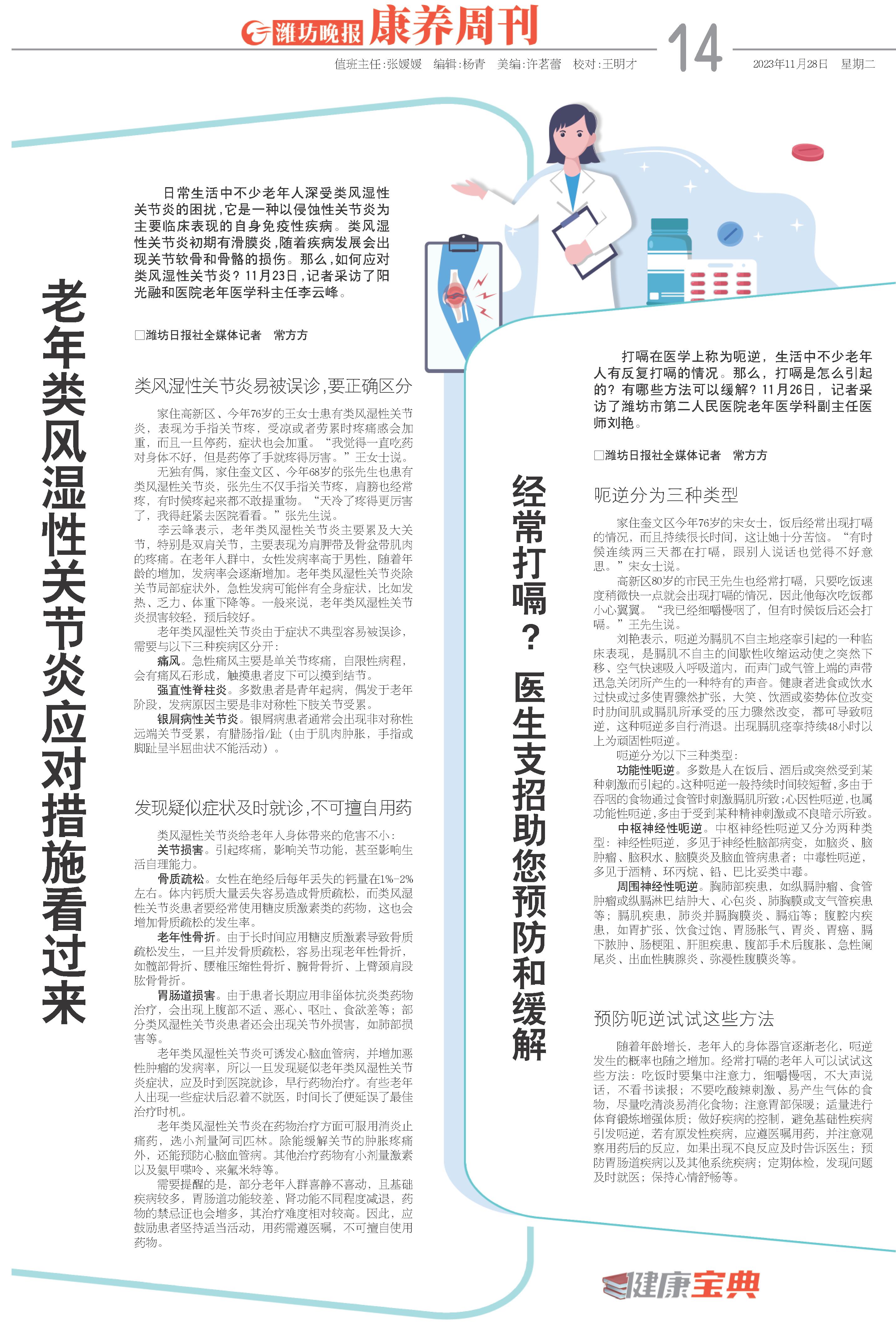 打嗝在医学上称为呃逆,生活中不少老年人有反复打嗝的情况。那么,打嗝是怎么引起的?有哪些方法可以缓解?11月26日,记者采访了潍坊市第二人民医院老年医学科副主任医师刘艳。