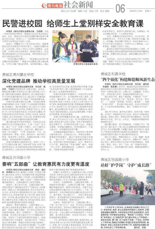 党建引领促教学质量提升。学校坚持以党建统领教育教学工作,党员教师带头深入课堂、深入学生,解决教学一线、学生身边的问题;实行清单管理,推动工作落实;打造自主互助个性化“双高”课堂,提高教育教学质量;借助潍城区智慧校园云平台、智学网平台,使信息技术与教育教学深度融合,建设智慧校园;构建“1+X”课程体系,推进“红色”思政课堂建设,创设红色德育课程,开展红色传统教育,夯实红色根基。
