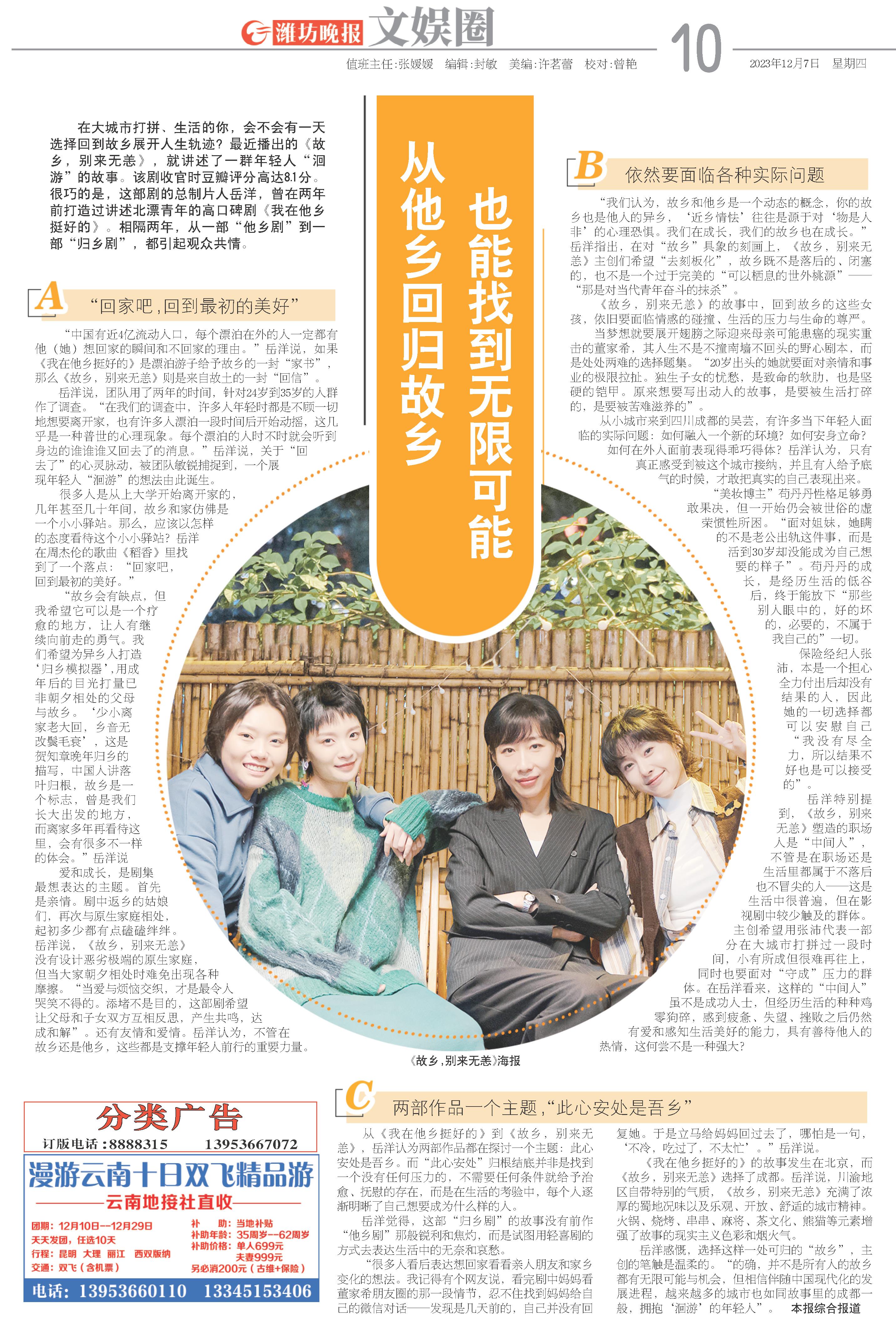 岳洋感慨,选择这样一处可归的“故乡”,主创的笔触是温柔的。“的确,并不是所有人的故乡都有无限可能与机会,但相信伴随中国现代化的发展进程,越来越多的城市也如同故事里的成都一般,拥抱‘洄游’的年轻人”。 本报综合报道