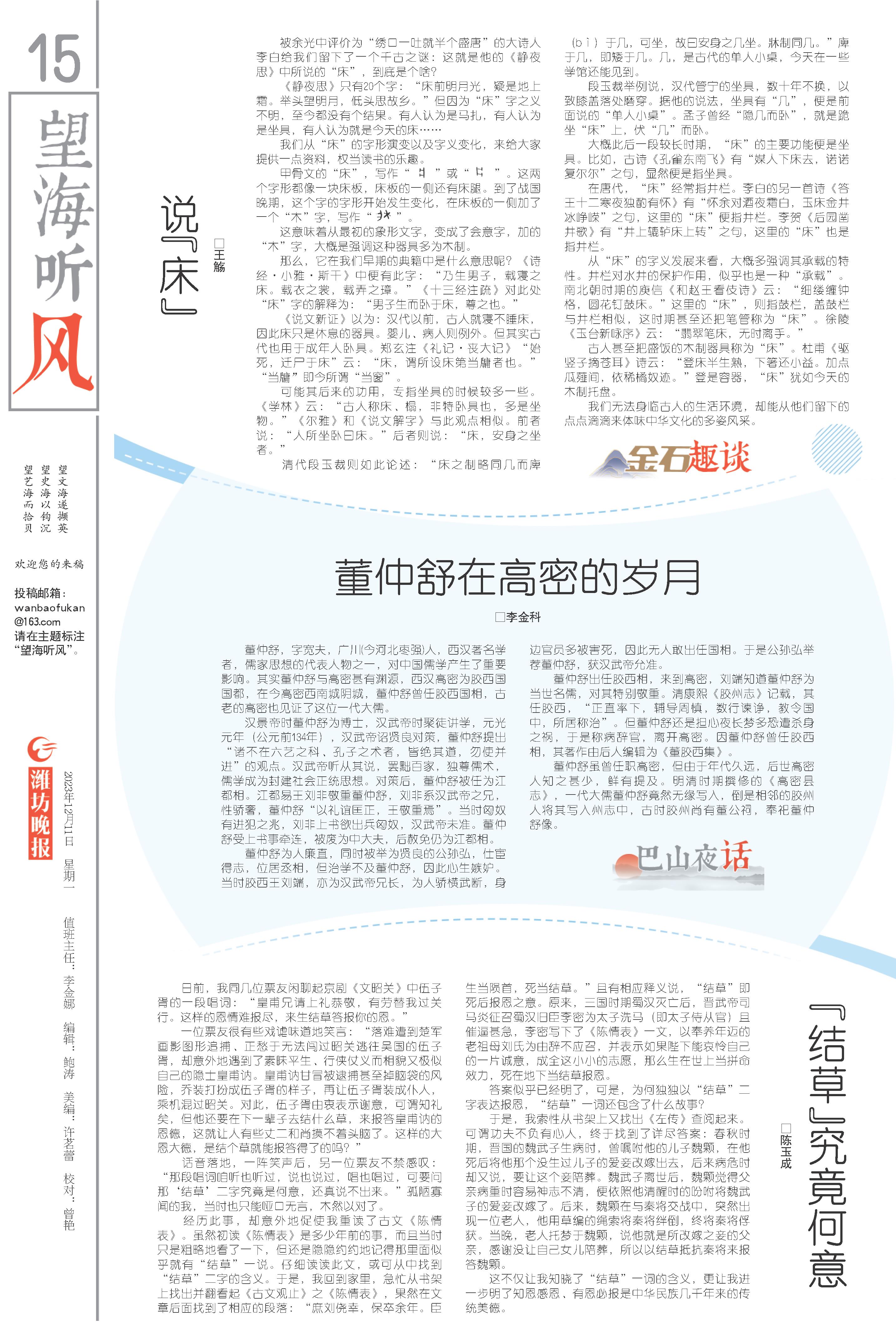 于是,我索性从书架上又找出《左传》查阅起来。可谓功夫不负有心人,终于找到了详尽答案:春秋时期,晋国的魏武子生病时,曾嘱咐他的儿子魏颗,在他死后将他那个没生过儿子的爱妾改嫁出去,后来病危时却又说,要让这个妾陪葬。魏武子离世后,魏颗觉得父亲病重时容易神志不清,便依照他清醒时的吩咐将魏武子的爱妾改嫁了。后来,魏颗在与秦将交战中,突然出现一位老人,他用草编的绳索将秦将绊倒,终将秦将俘获。当晚,老人托梦于魏颗,说他就是所改嫁之妾的父亲,感谢没让自己女儿陪葬,所以以结草抵抗秦将来报答魏颗。