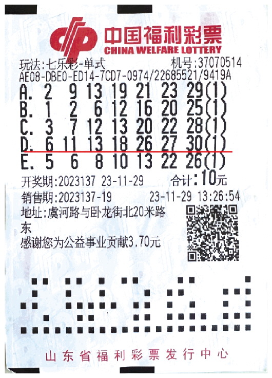 11月29日,七乐彩第2023137期开奖,基本号码“06 11 13 18 26 27 30”,特别号码“01”。潍坊彩友独揽全国唯一1注七乐彩一等奖,奖金195万元。大奖诞生在奎文区37070514号福彩站,中奖彩友刘先生(化姓)凭借一张10元自选单式票击中大奖。